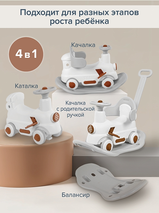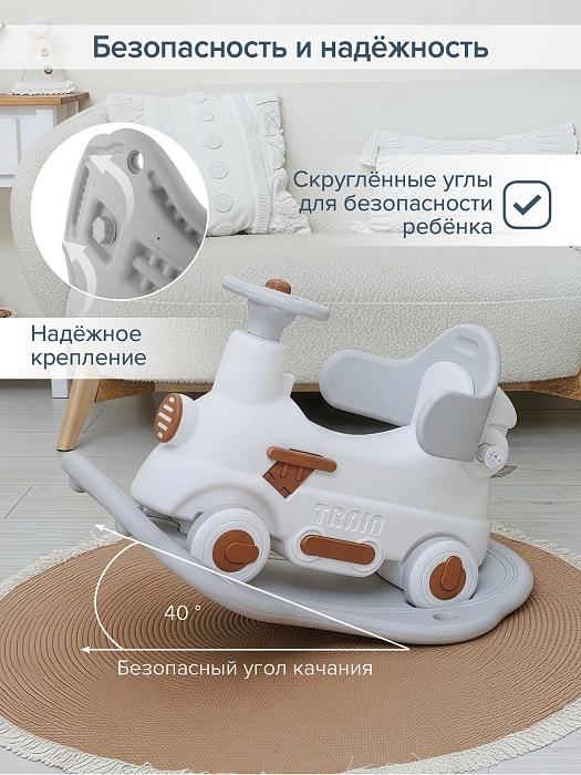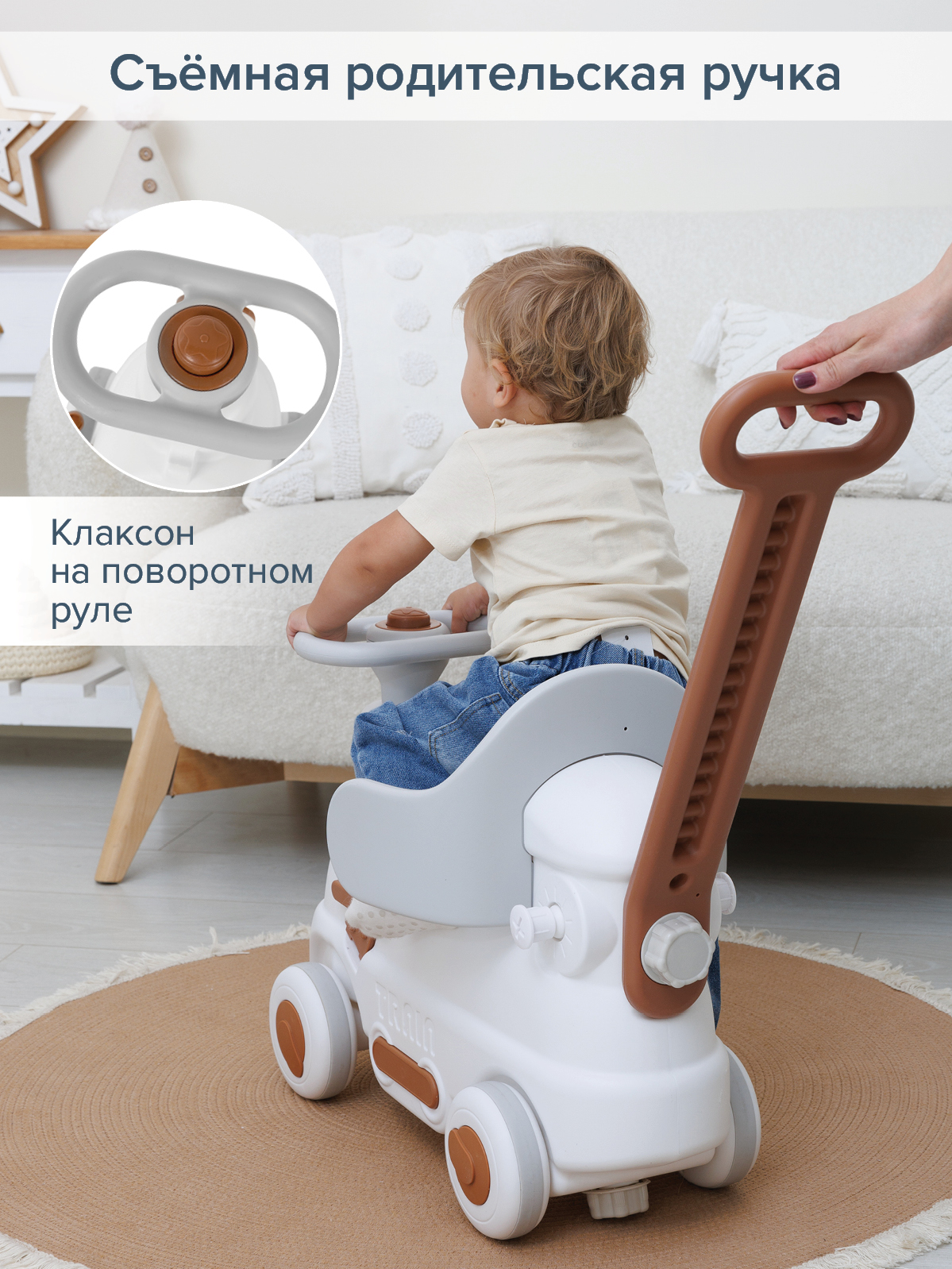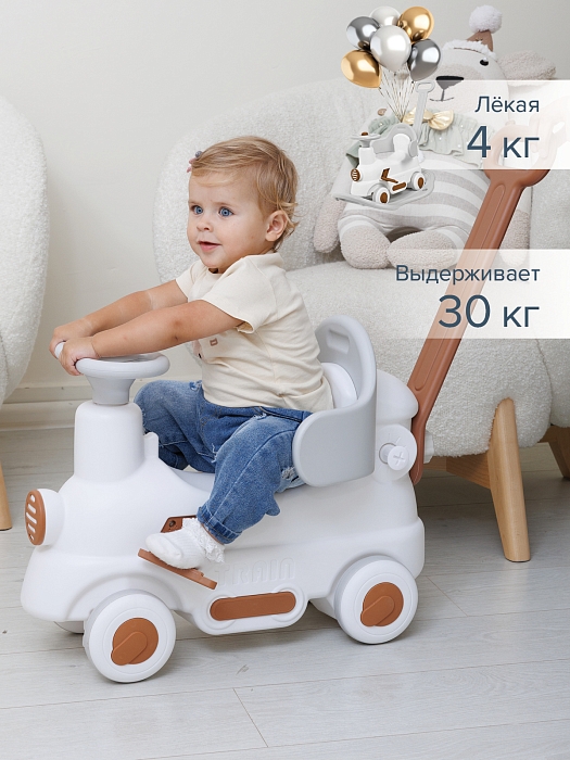 Съемная родительская ручка превращает качалку-каталку в увлекательную детскую поезд-каталку. Складные педали выполнены таким образом, что ножка ребенка на них не скользила за счет особого покрытия.
