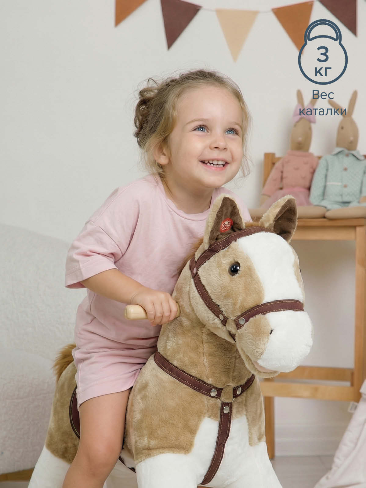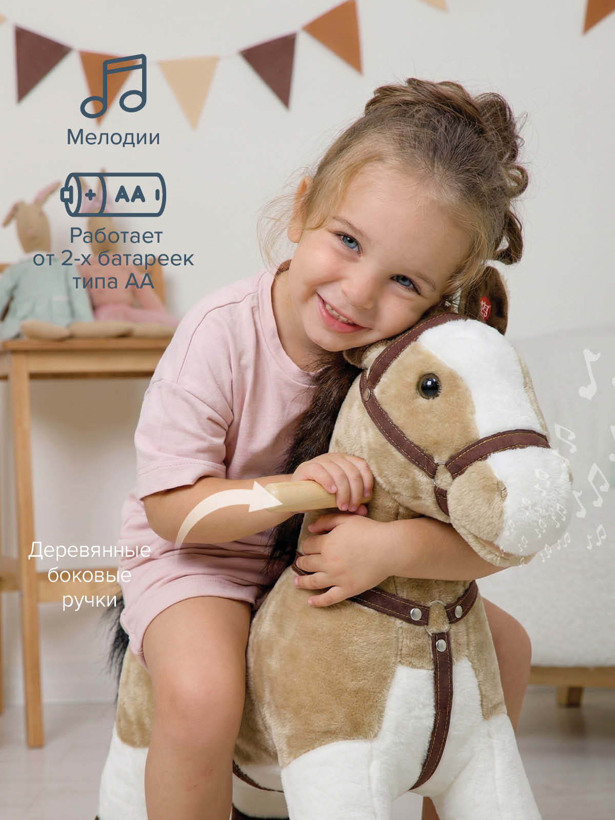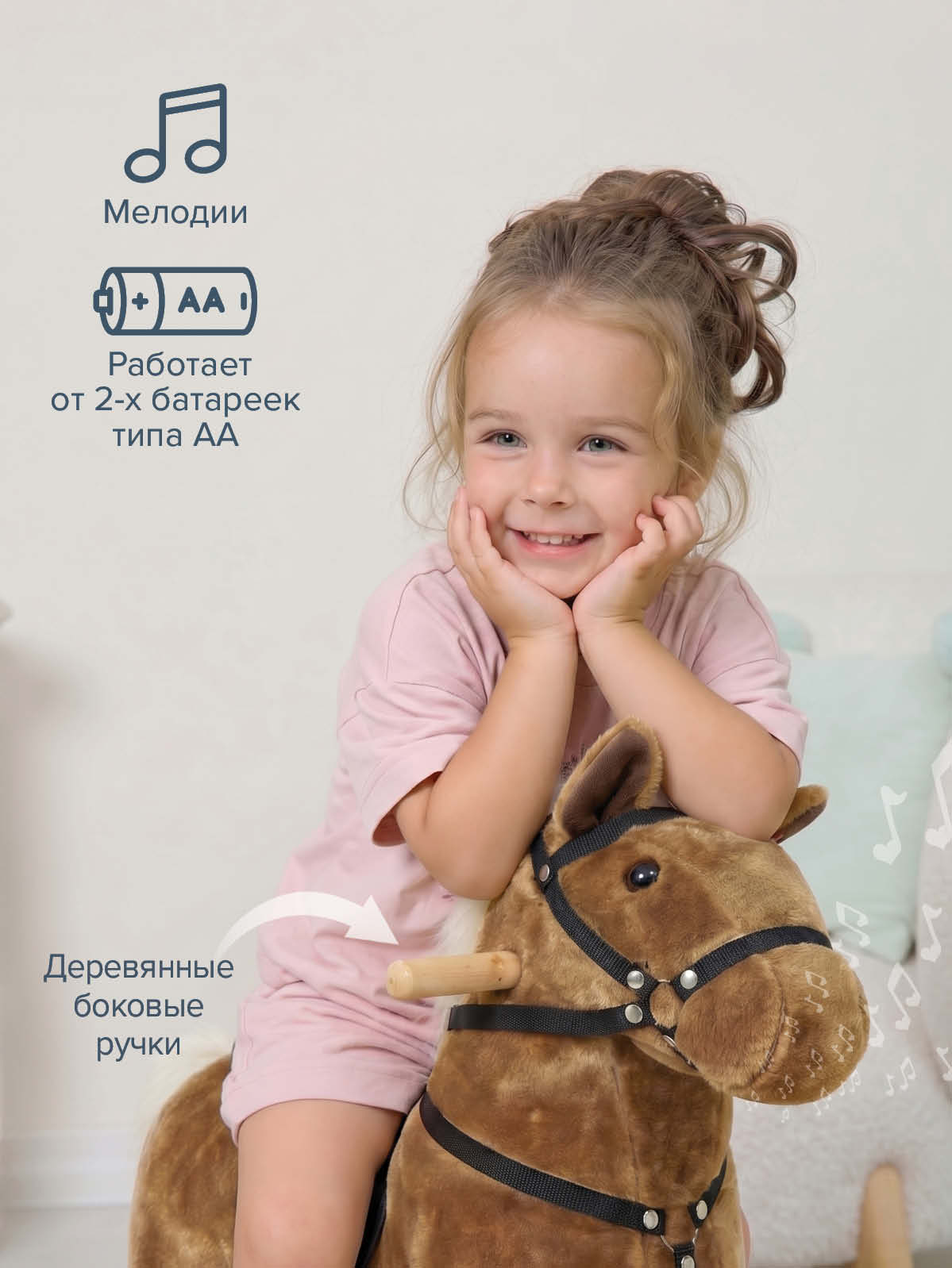 - Тип: каталка‑лошадка с колесиками и звуковыми эффектами;
