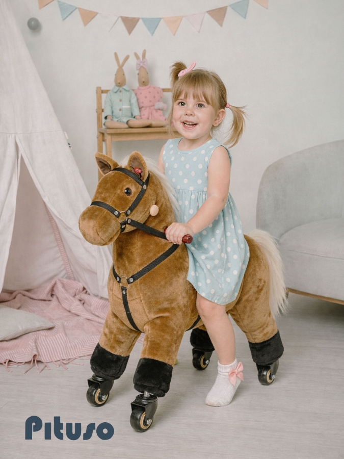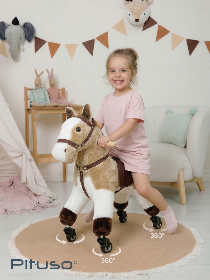 Каталка‑лошадка Pituso – мягкая плюшевая игрушка‑лошадка с колесиками и звуком, которая объединяет сразу несколько функций: каталка, качалка и интерактивный «питомец». Ребёнку легко вообразить себя настоящим наездником: длинная грива и хвост с пушистым ворсом создают эффект живой лошади и делают игру увлекательной надолго.