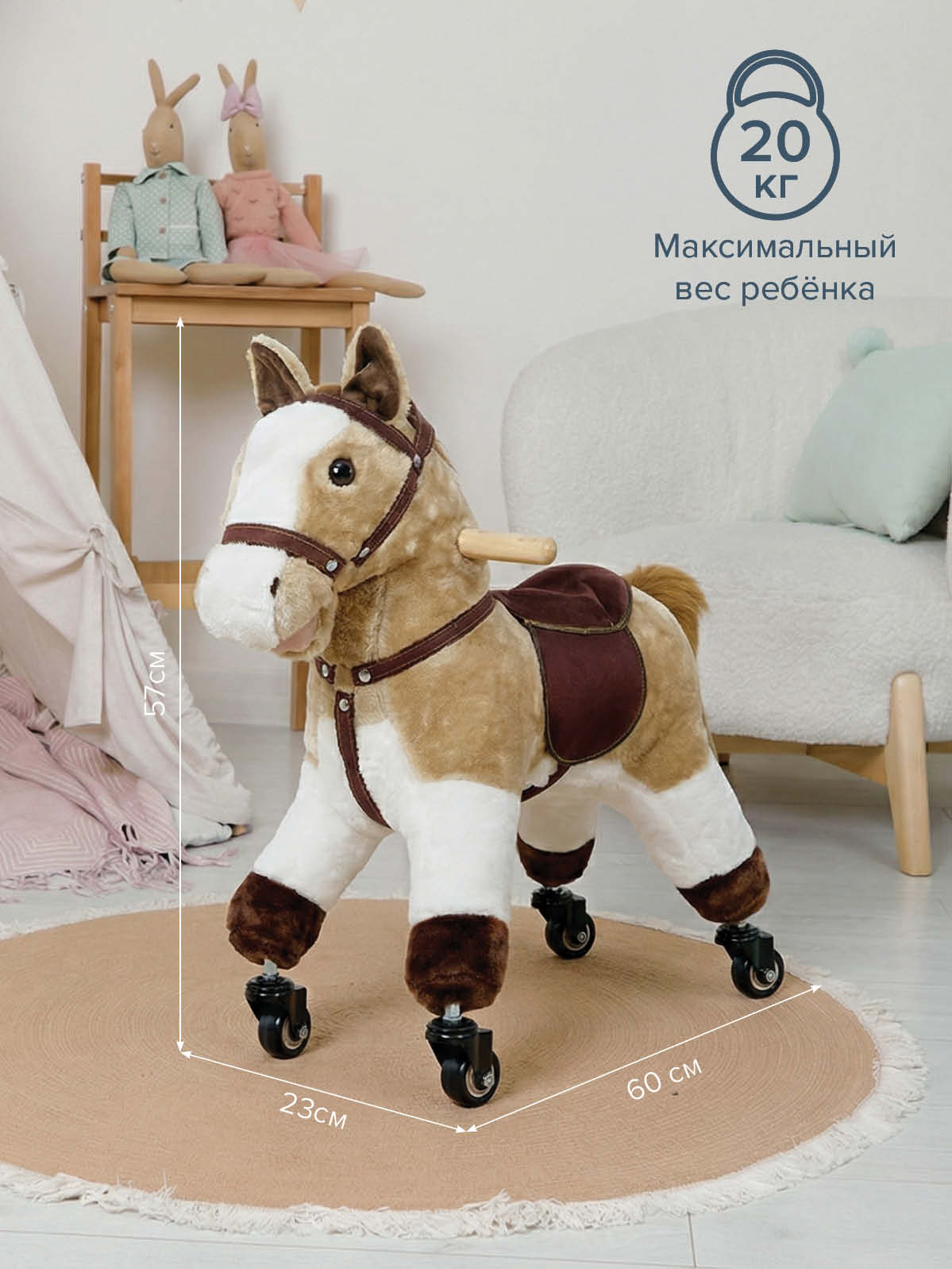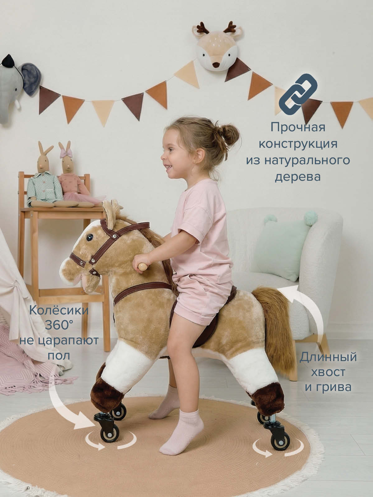 Корпус лошадки обтянут приятной на ощупь плюшевой «шерсткой», внутри – прочная конструкция с удобным седлом и сбруей, чтобы ребёнок чувствовал себя устойчиво во время катания. Деревянные ручки по бокам рассчитаны под маленькие ладошки – малыш может уверенно держаться и сохранять равновесие. Пластиковые колесики вращаются на 360°, позволяя легко менять направление движения по комнате или коридору, а компактные размеры делают игрушку удобной для использования дома, на даче или в загородном доме.