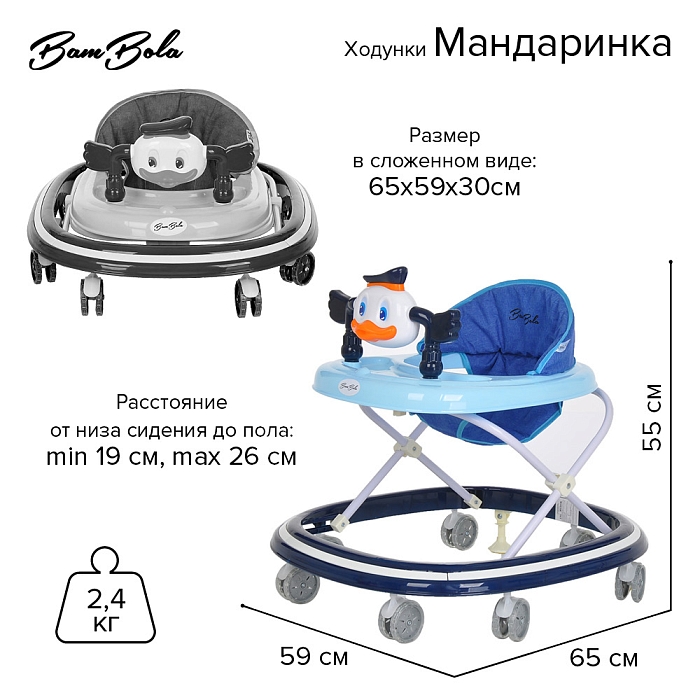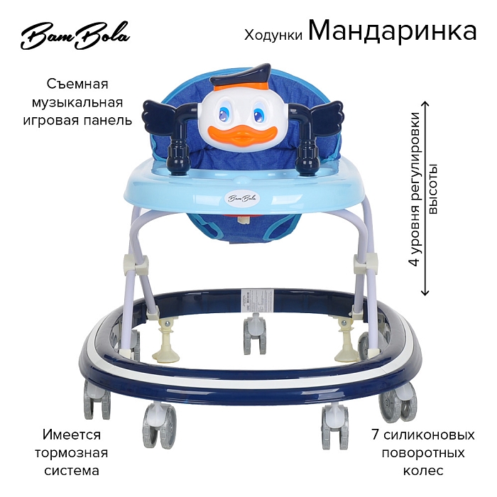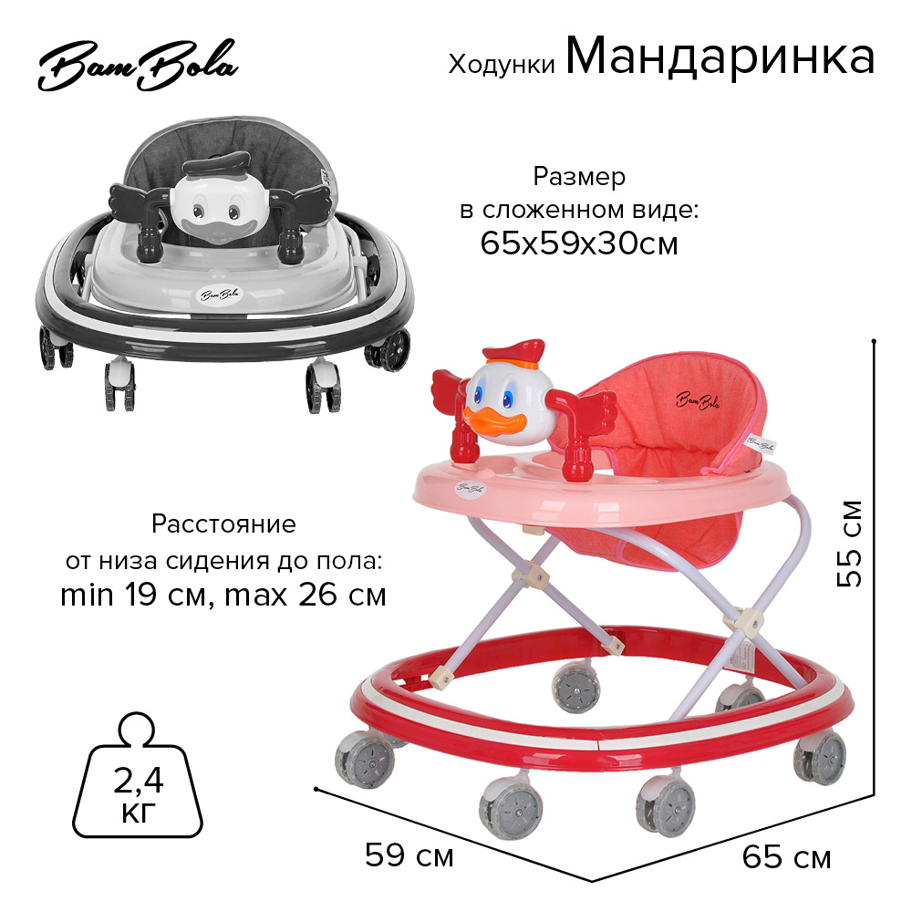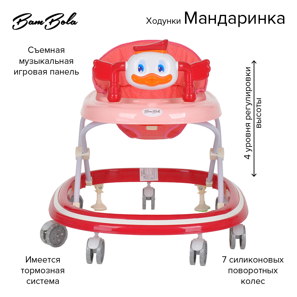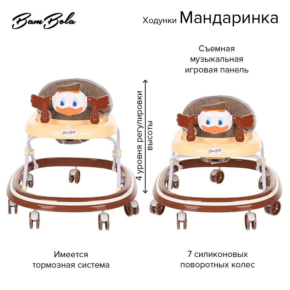 Ходунки Bambola Мандаринка подготовят малыша к первым самостоятельным шагам, развивают координацию движений и помогают ребенку научиться держать равновесие. Имеют съемную музыкальную игровую панель. Мягкое, удобное сиденье. Ходунки легко регулируются в зависимости от роста ребенка.