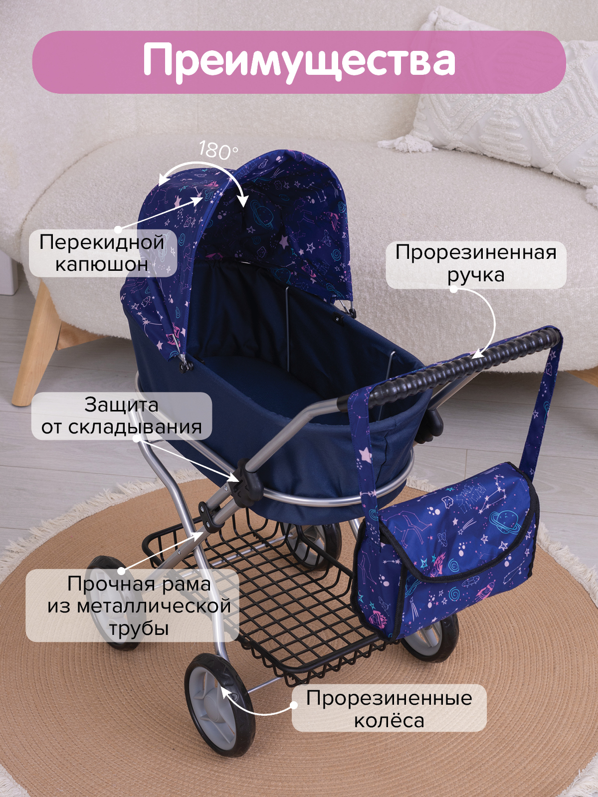 Прорезиненные колеса диаметром 10см, люлька 44х23см, складной капюшон