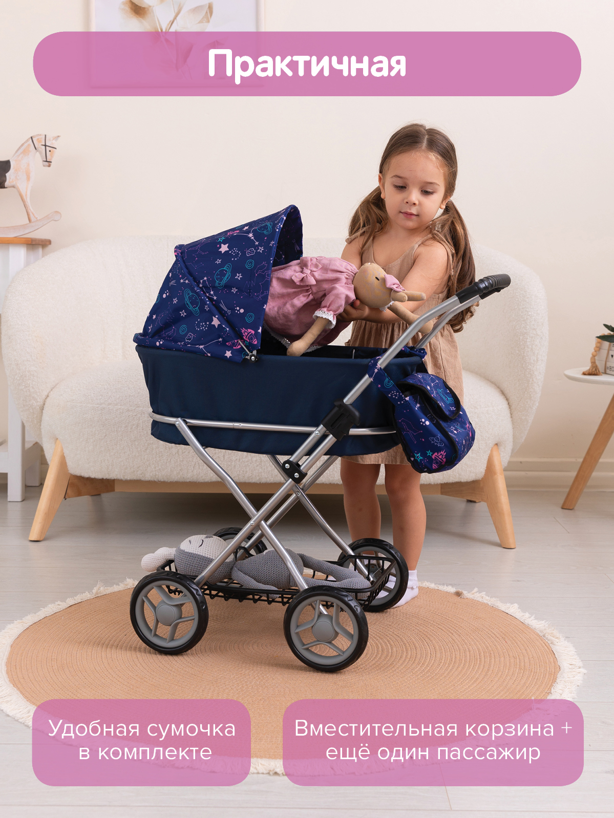 Прогулочная игровая коляска для кукол выглядит как маленькая копия настоящей современной коляски для детей.