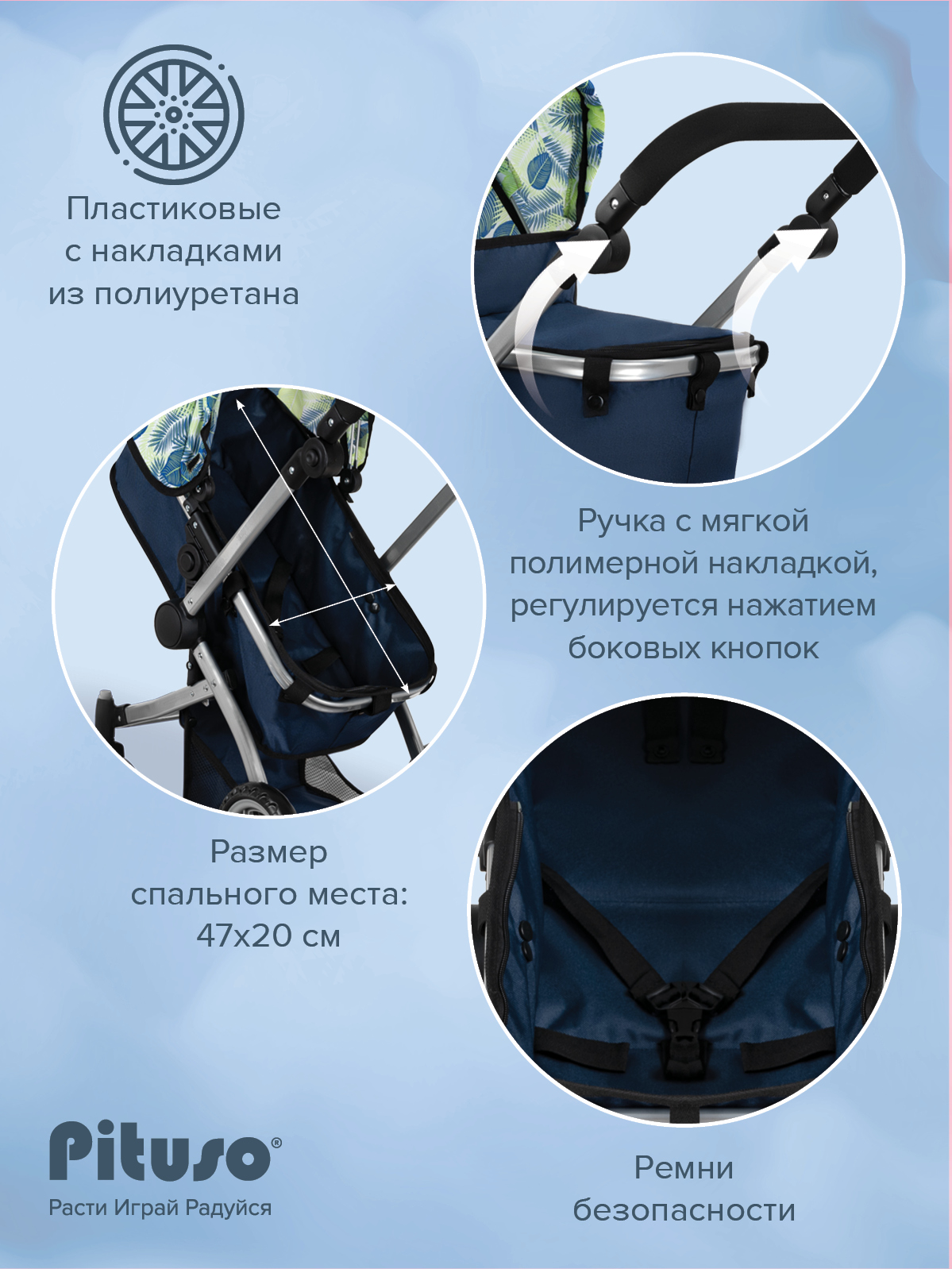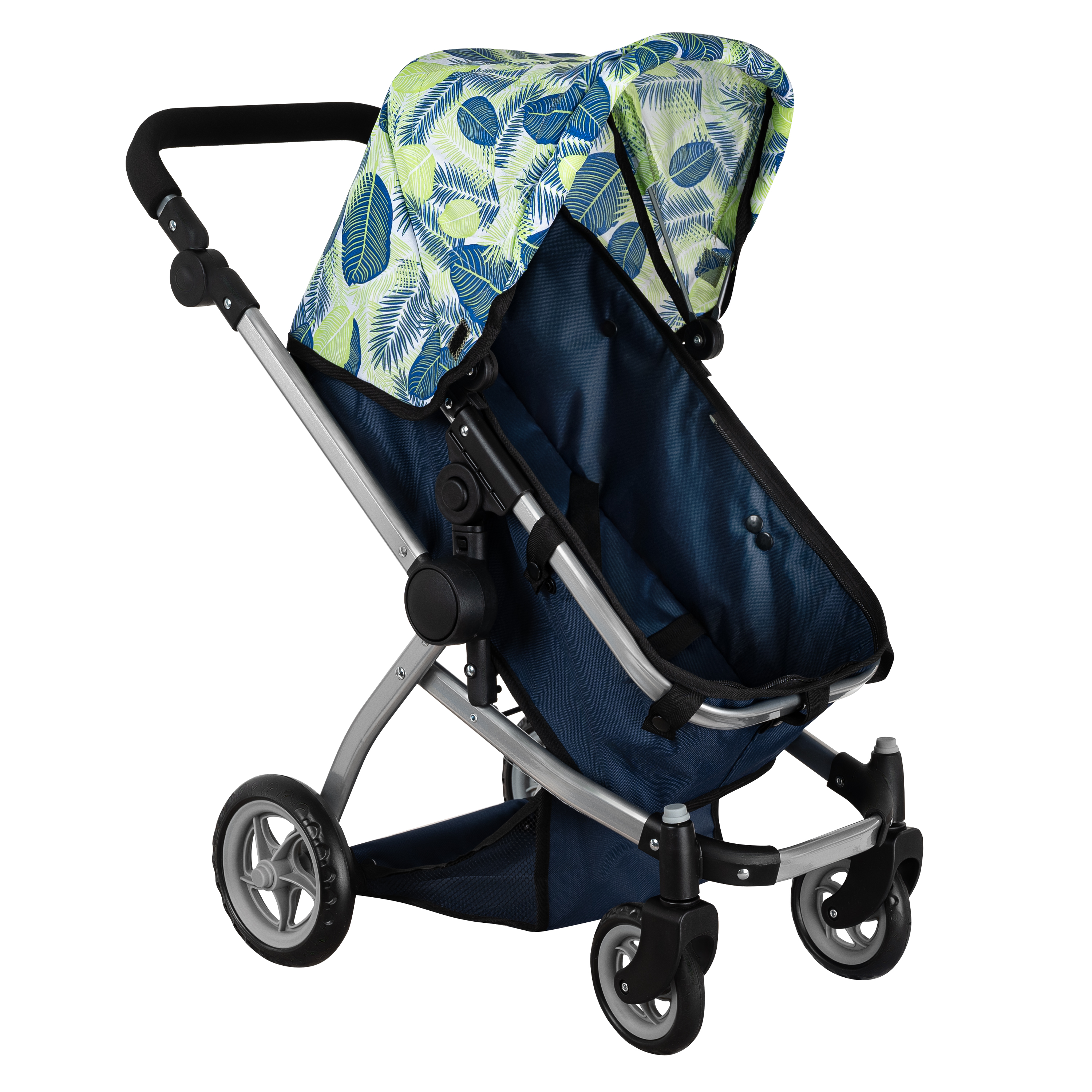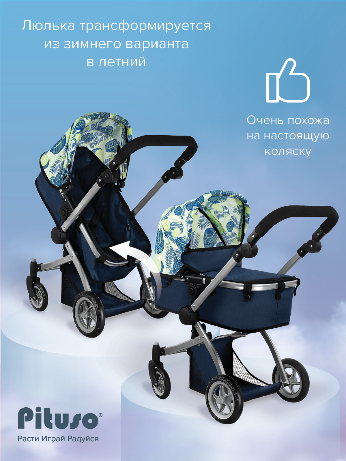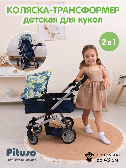 Кукольная коляска-трансформер Pituso Deep Blue/Листочки/Синий