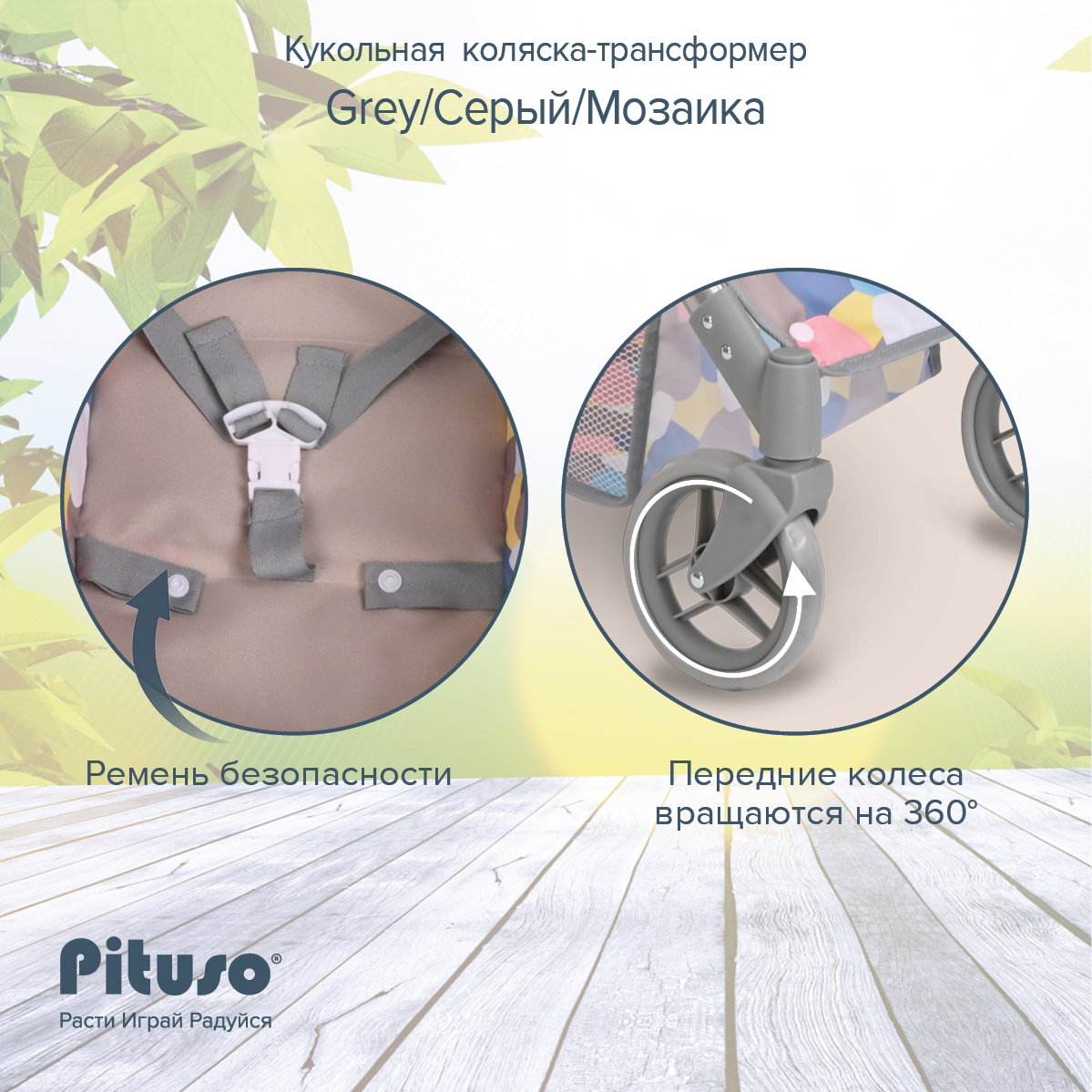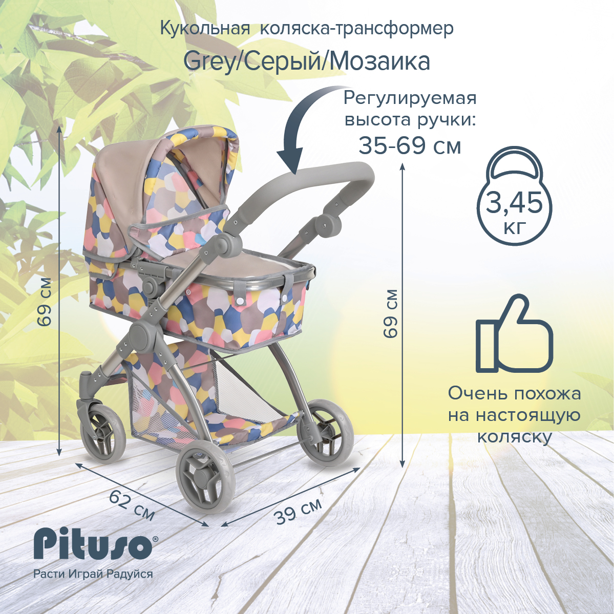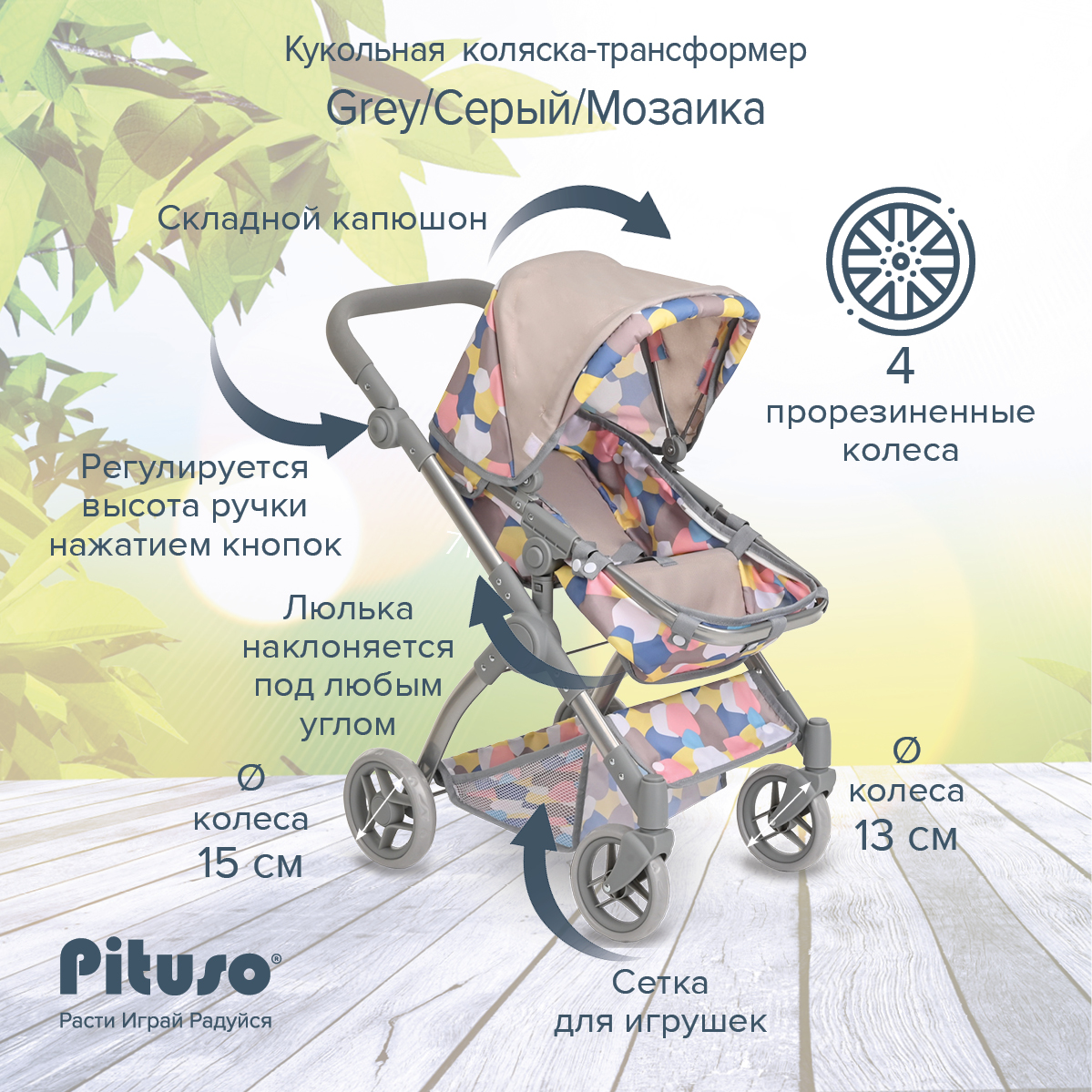 Кукольная коляска-трансформер Pituso Grey/Серый/Мозаика