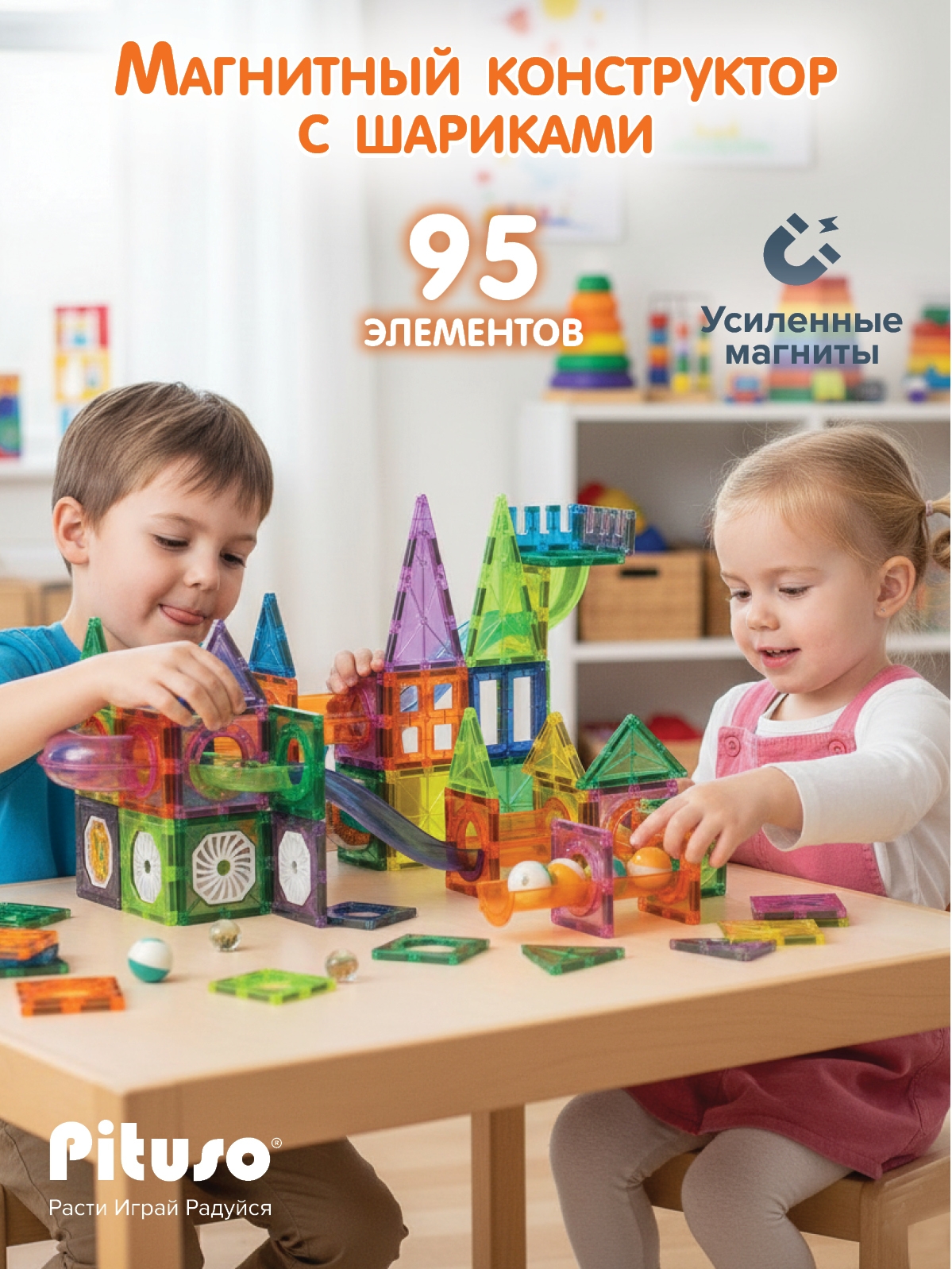 Конструктор на магнитах можно дополнять новыми элементами и совмещать с другими игровыми наборами серии Pituso.