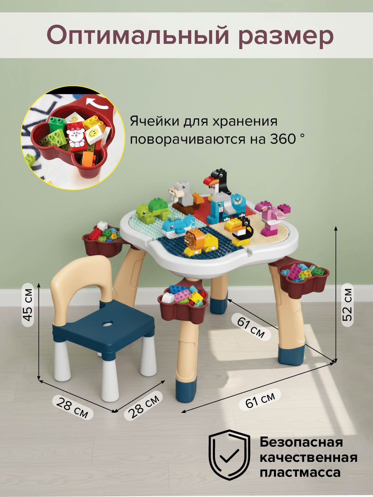 В наборе: стол для конструирования + 1 стульчик + конструктор 100 элементов.