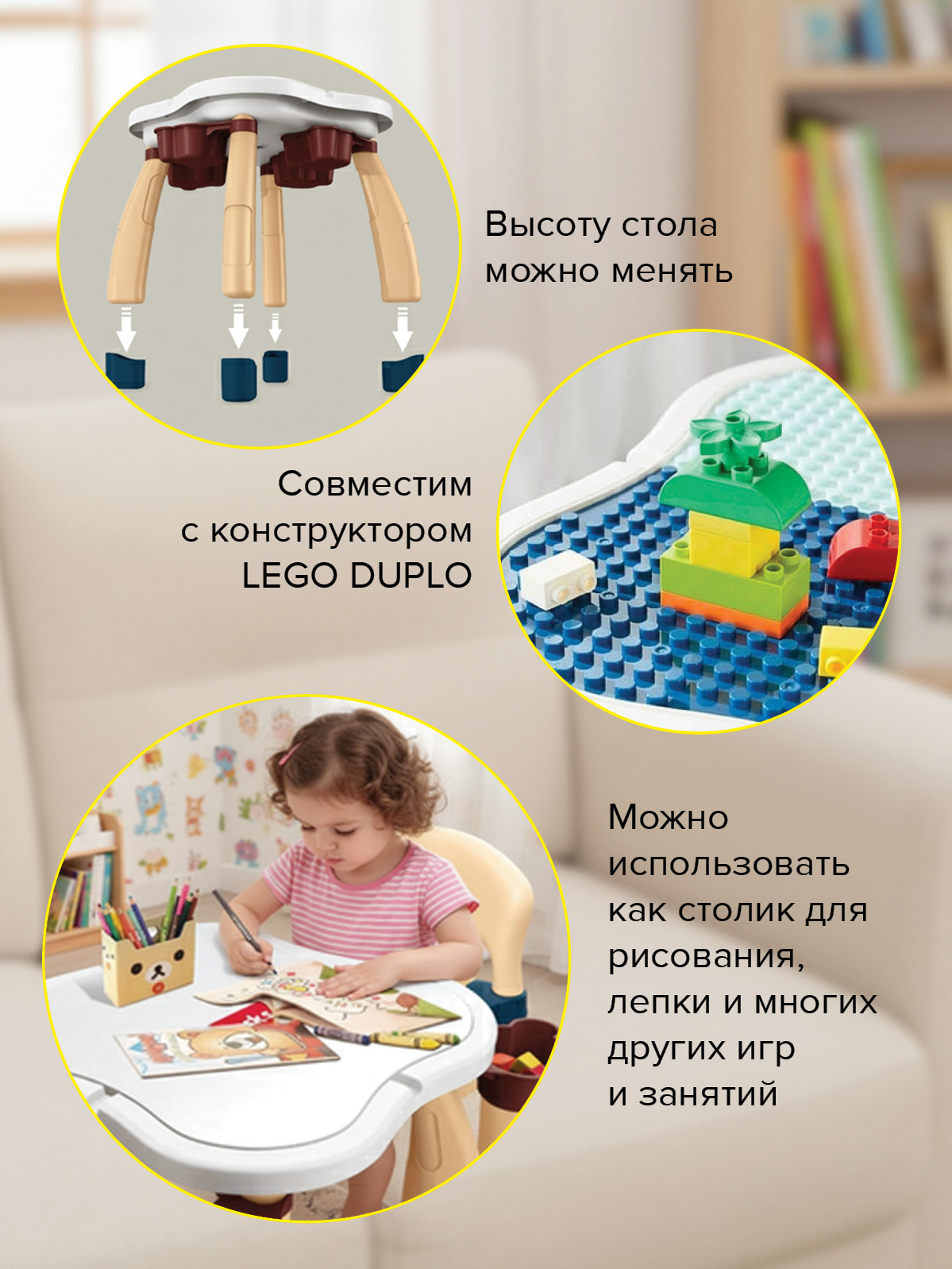 Так же перевернув столешницу, столик можно использовать как столик для рисования, лепки и многих других игр и занятий.