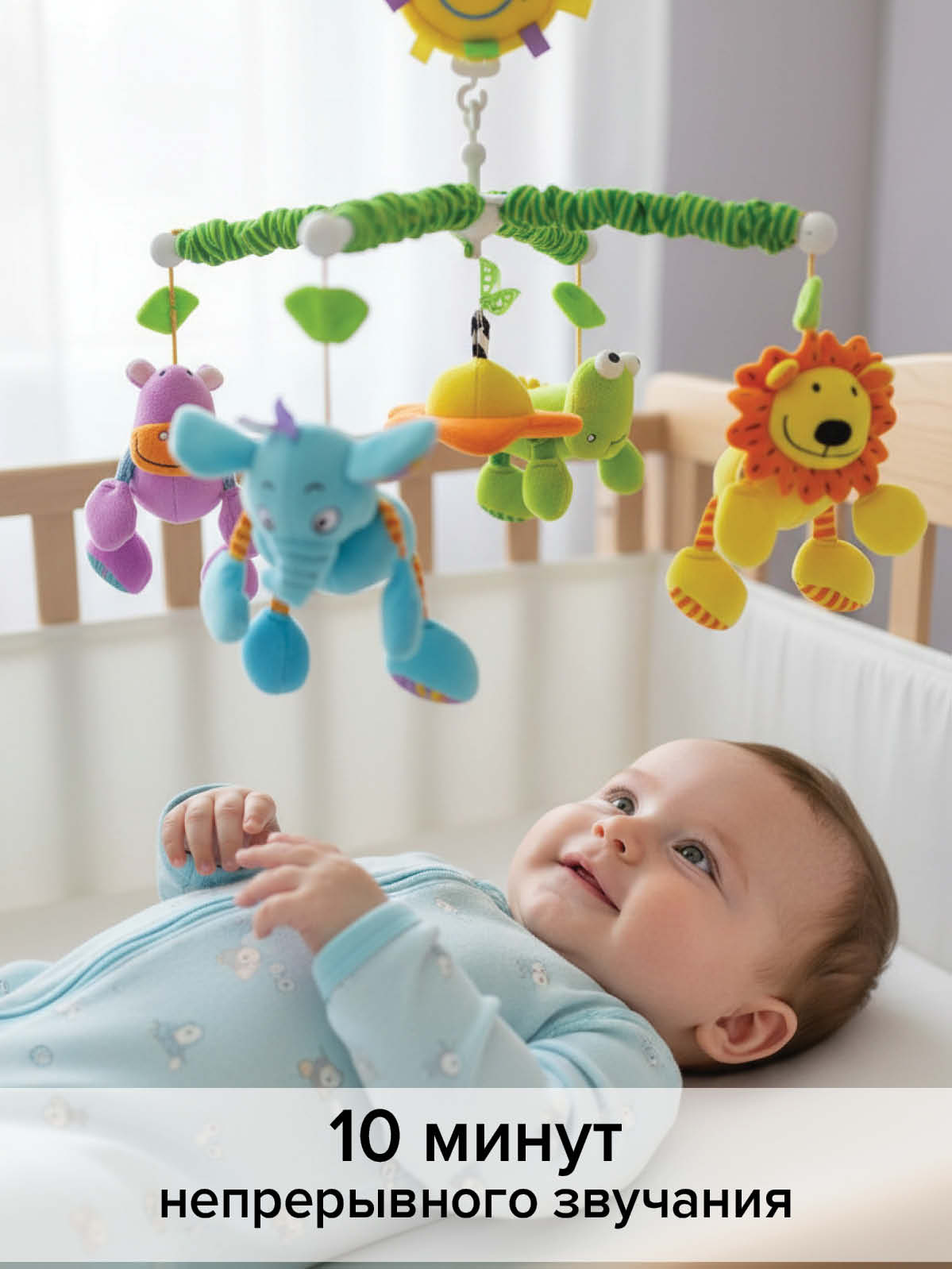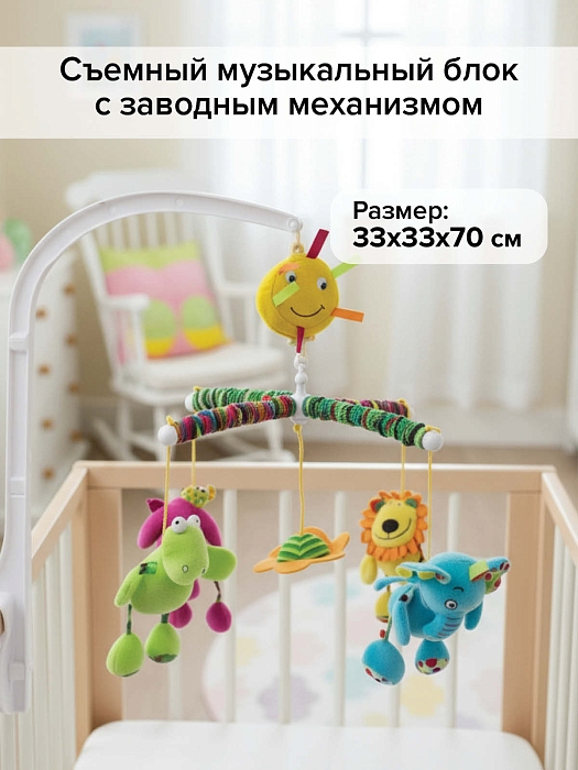 - Музыкальный мобиль с яркими и мягкими набивными игрушками;