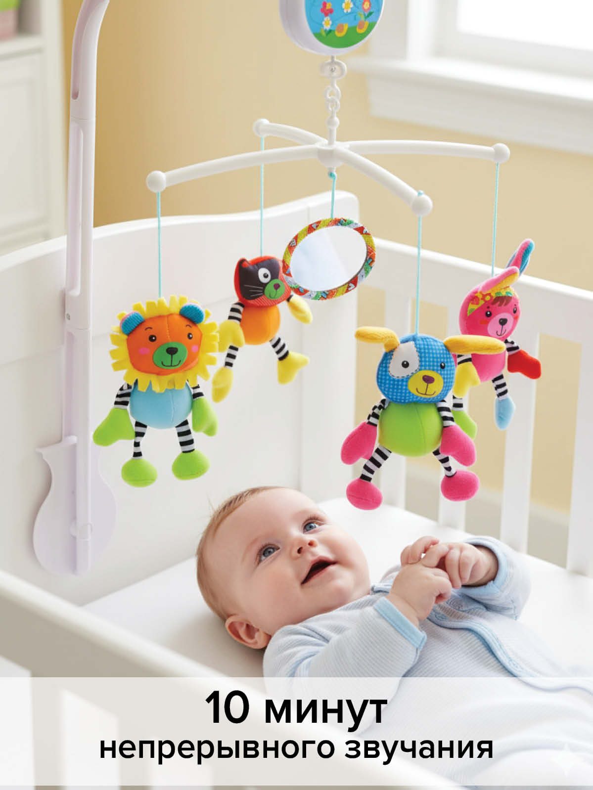 - Музыкальный мобиль с яркими и мягкими набивными игрушками;