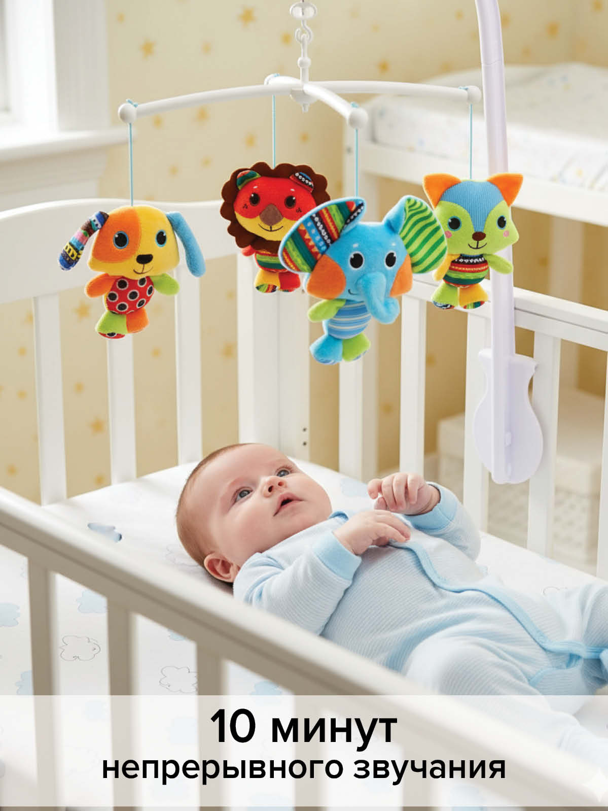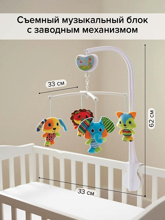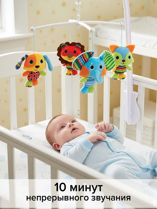 Музыкальный мобиль с яркими и мягкими набивными игрушками.