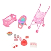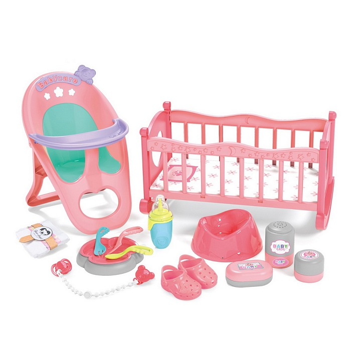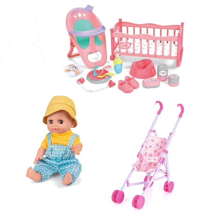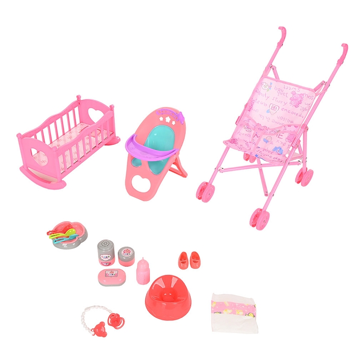 В комплект входят: Пупс с одеждой - 1 шт., стул - 1 шт., кроватка-1шт., коляска для кукол-1шт., ложка-1шт., вилка-1шт., нож-1шт., тарелка-1шт., бутылочка-1шт.,пустышка-1шт.,обувь-1 пара, горшок - 1 шт., памперс - 1шт., бутылочка для моющих средств (имитация)- 1 шт., присыпка (имитация) -1 шт., макет крема-1шт..