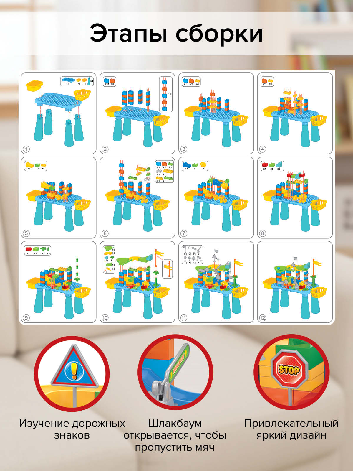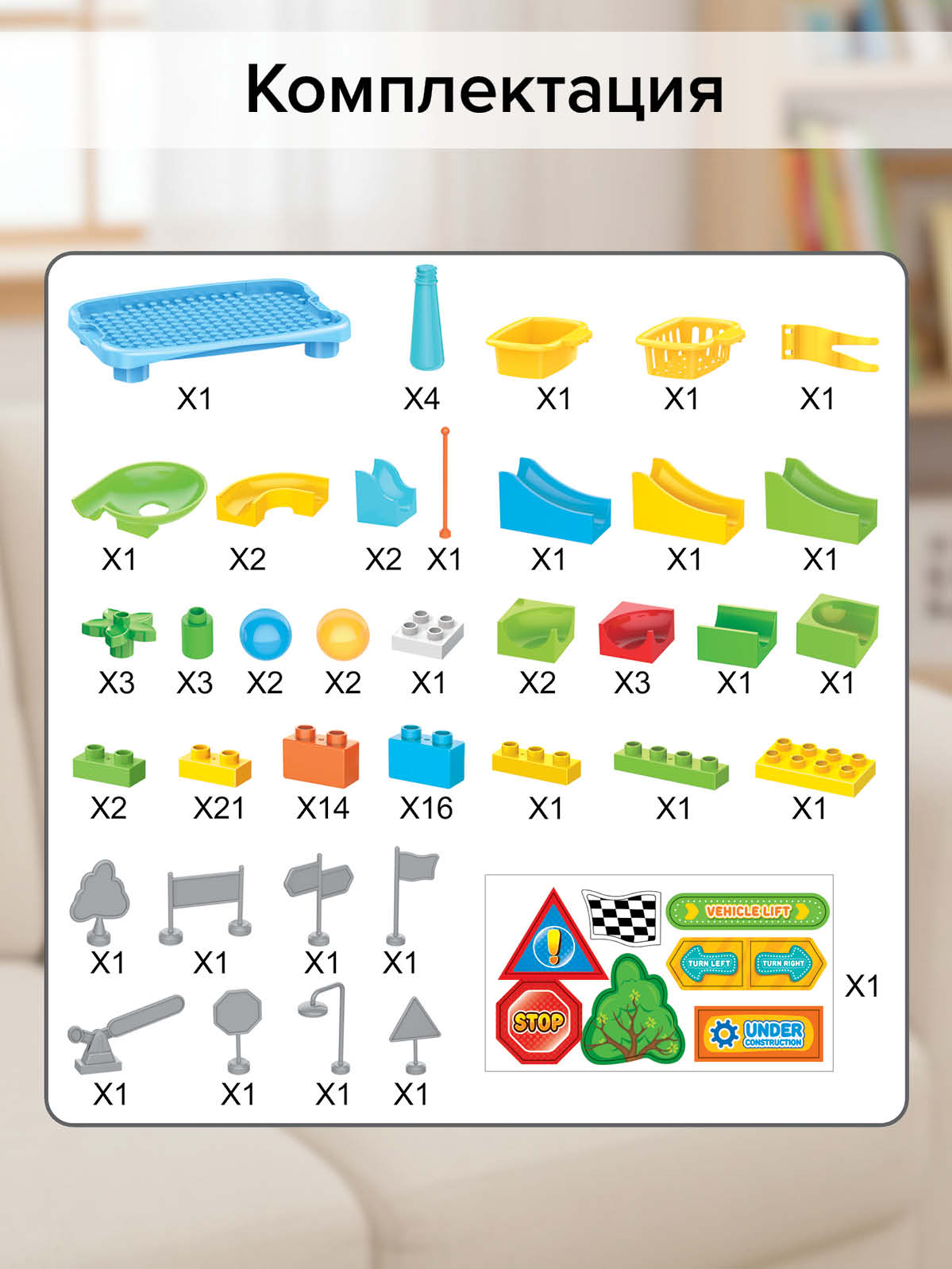 Из элементов конструктора можно собрать многоуровневую дорожку, по которой с легкостью будет катиться шар. Вдоль дорожки установлены различные дорожные знаки и шлагбаум.