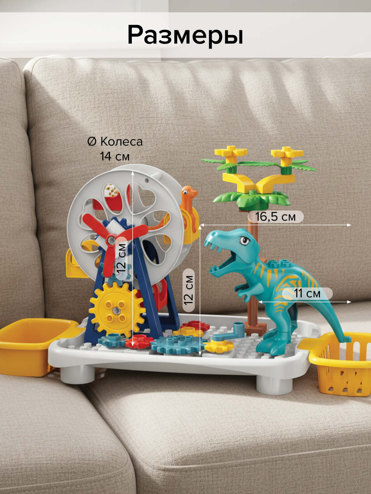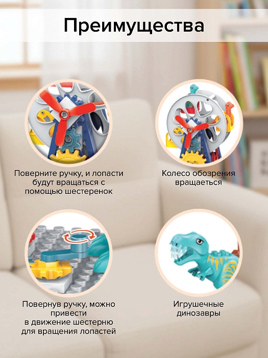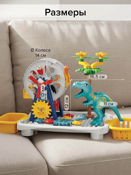 Из элементов конструктора можно собрать вращающуюся карусель, пальму, в наборе 3 динозавра.