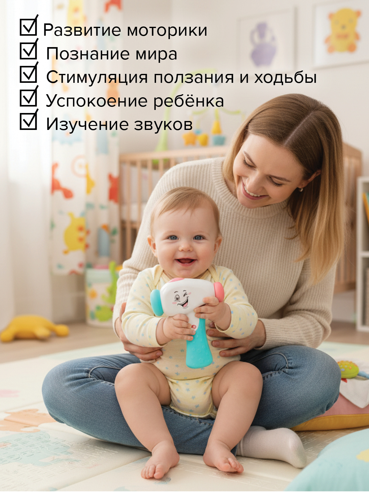Развивающая игрушка исполнена в виде удобного молоточка с мягким наконечником и удобной ручкой