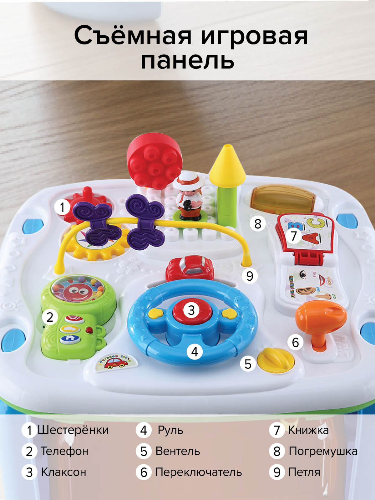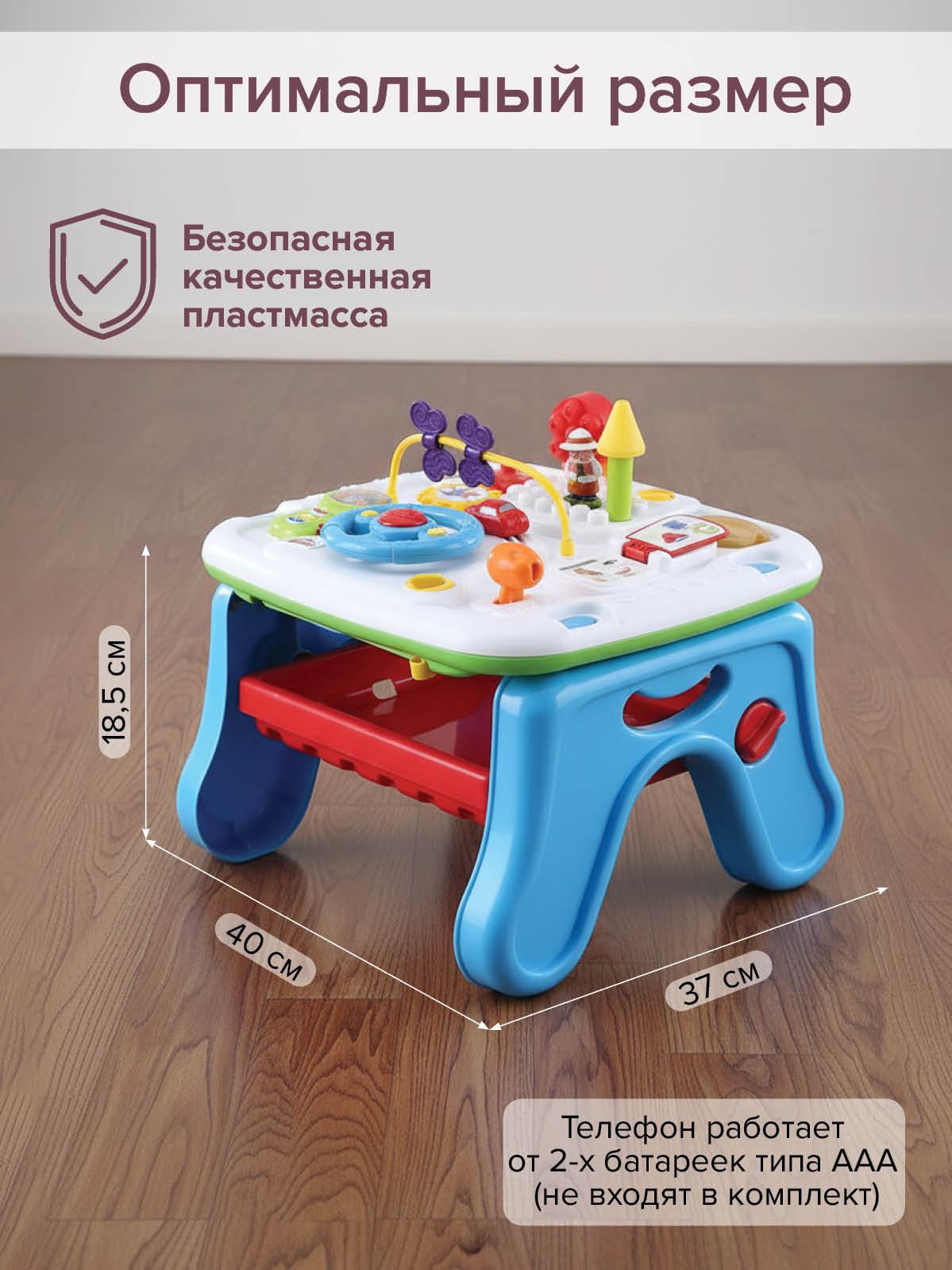 Развивающий центр Строитель выполнен в виде игрового столика, который имеет двустороннюю игровую панель.
