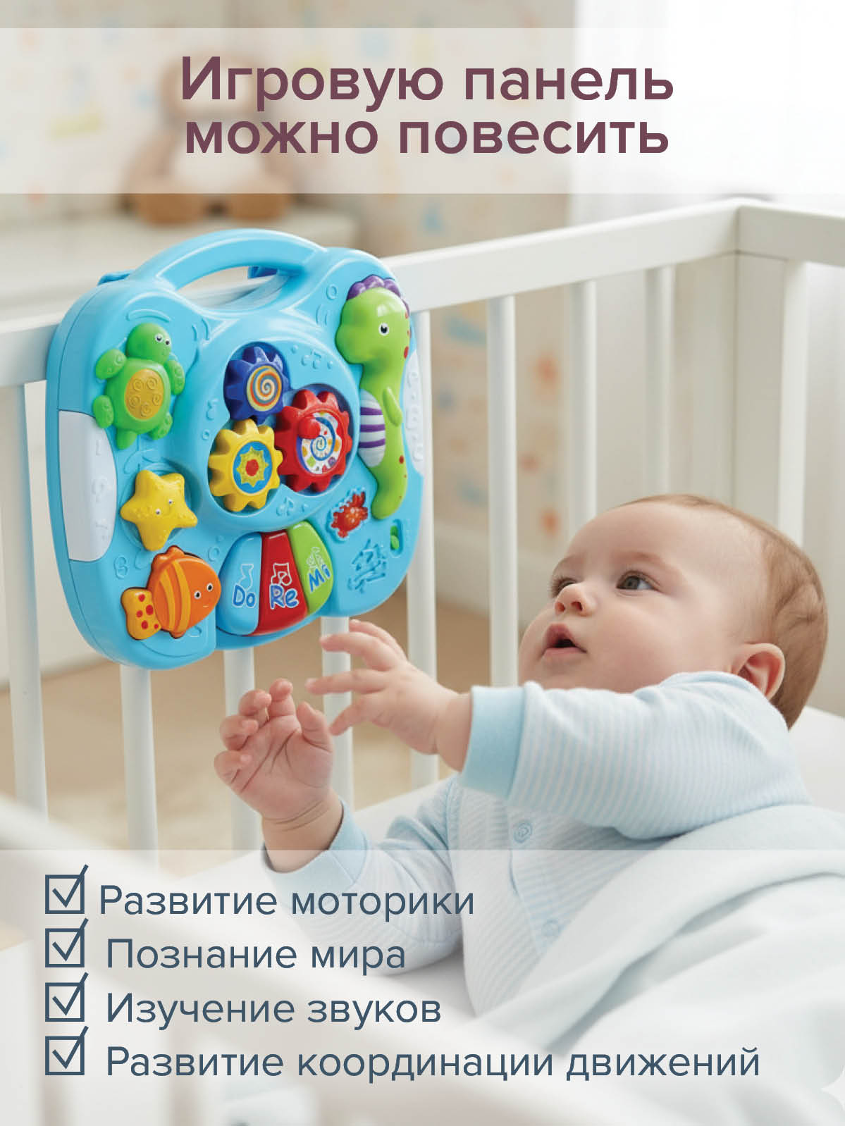 Игрушку можно использовать как столик или повесить на спинку кроватки.