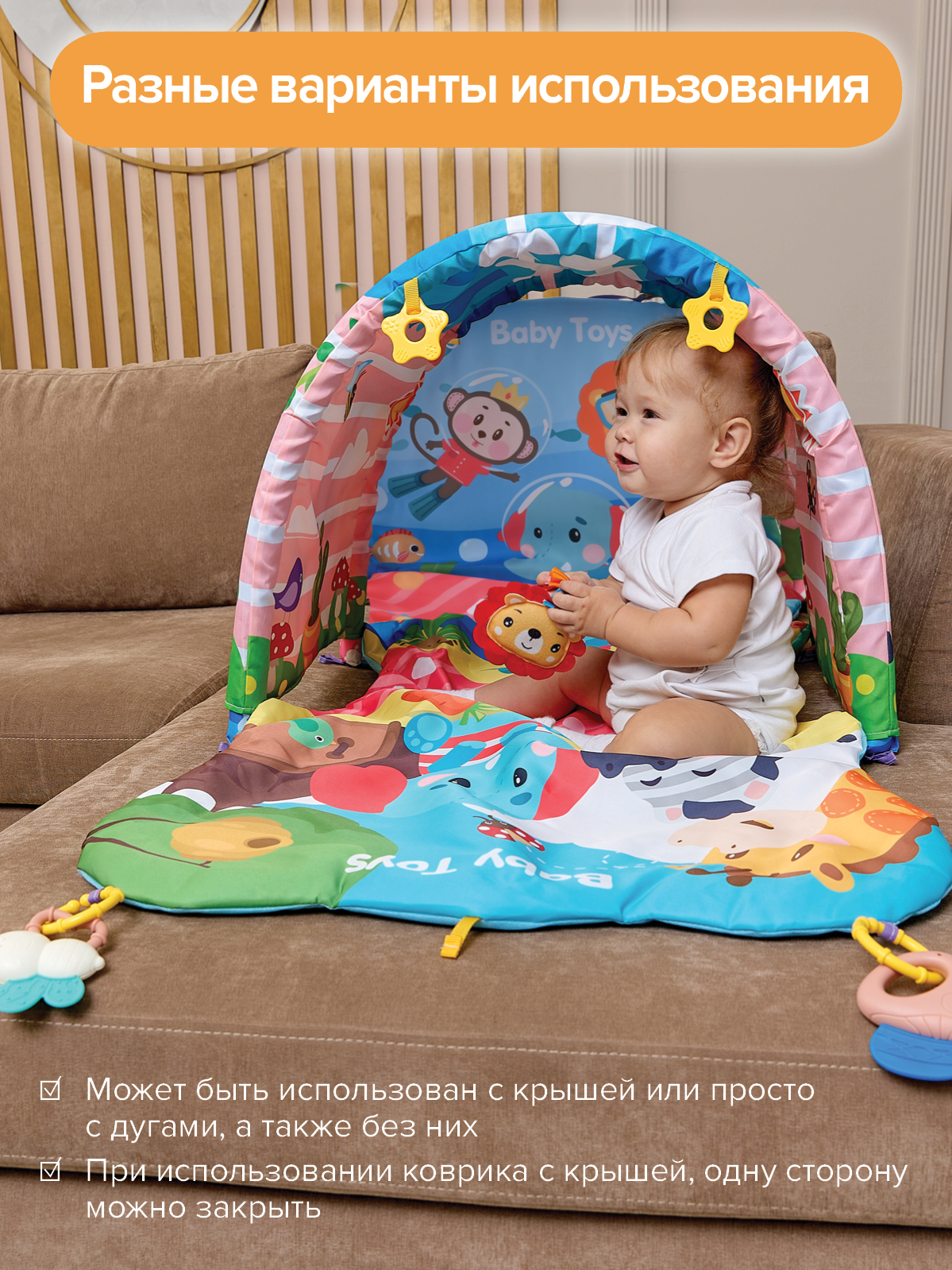 Коврик можно выносить с собой на природу, брать на дачу и использовать как безопасное место для игр с различными игрушками.