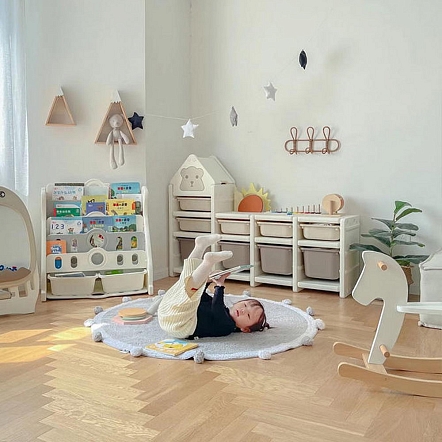 Стеллаж имеет необычный дизайн, что привлечет ребенка к самостоятельной уборке своих вещей.