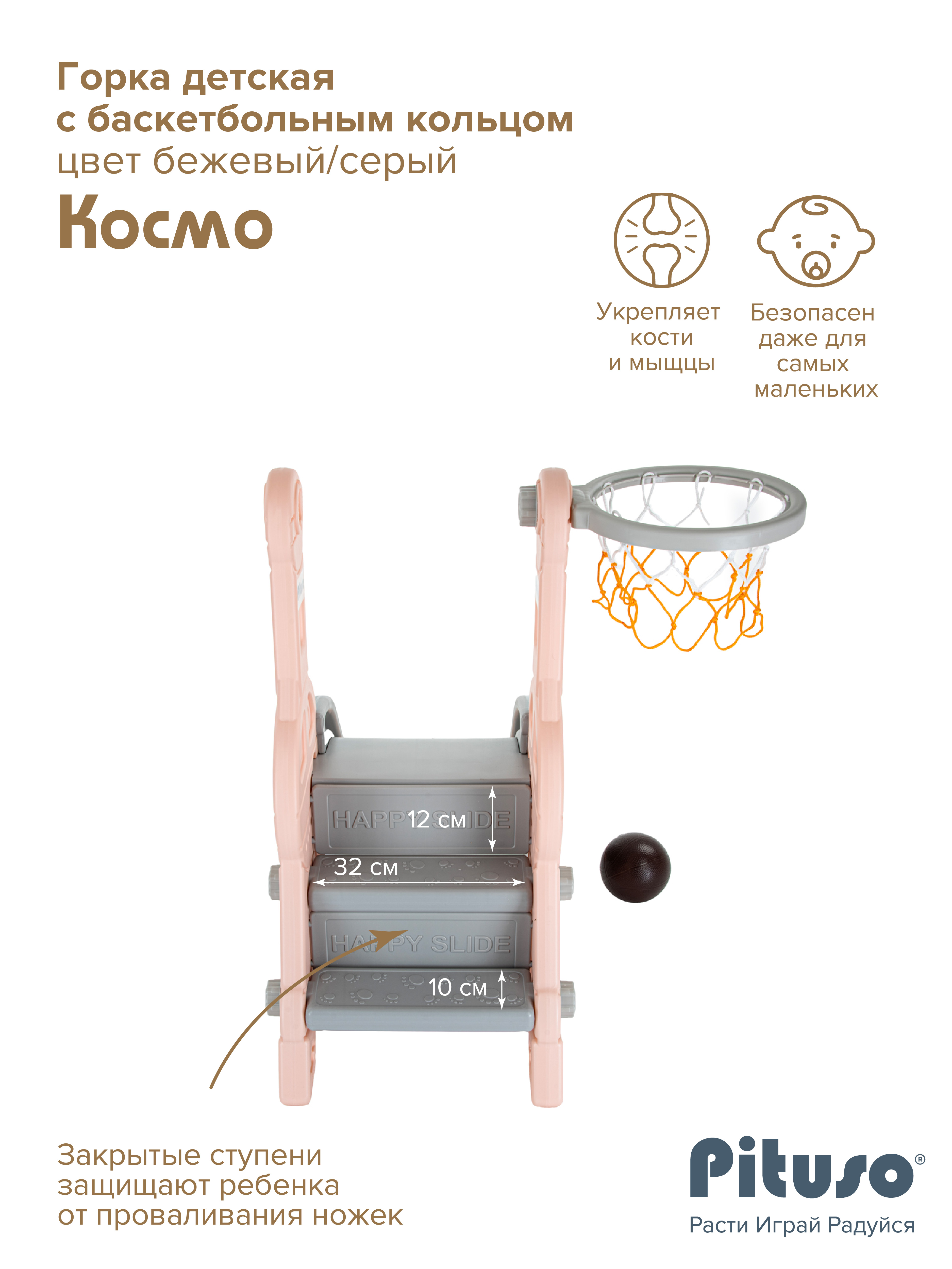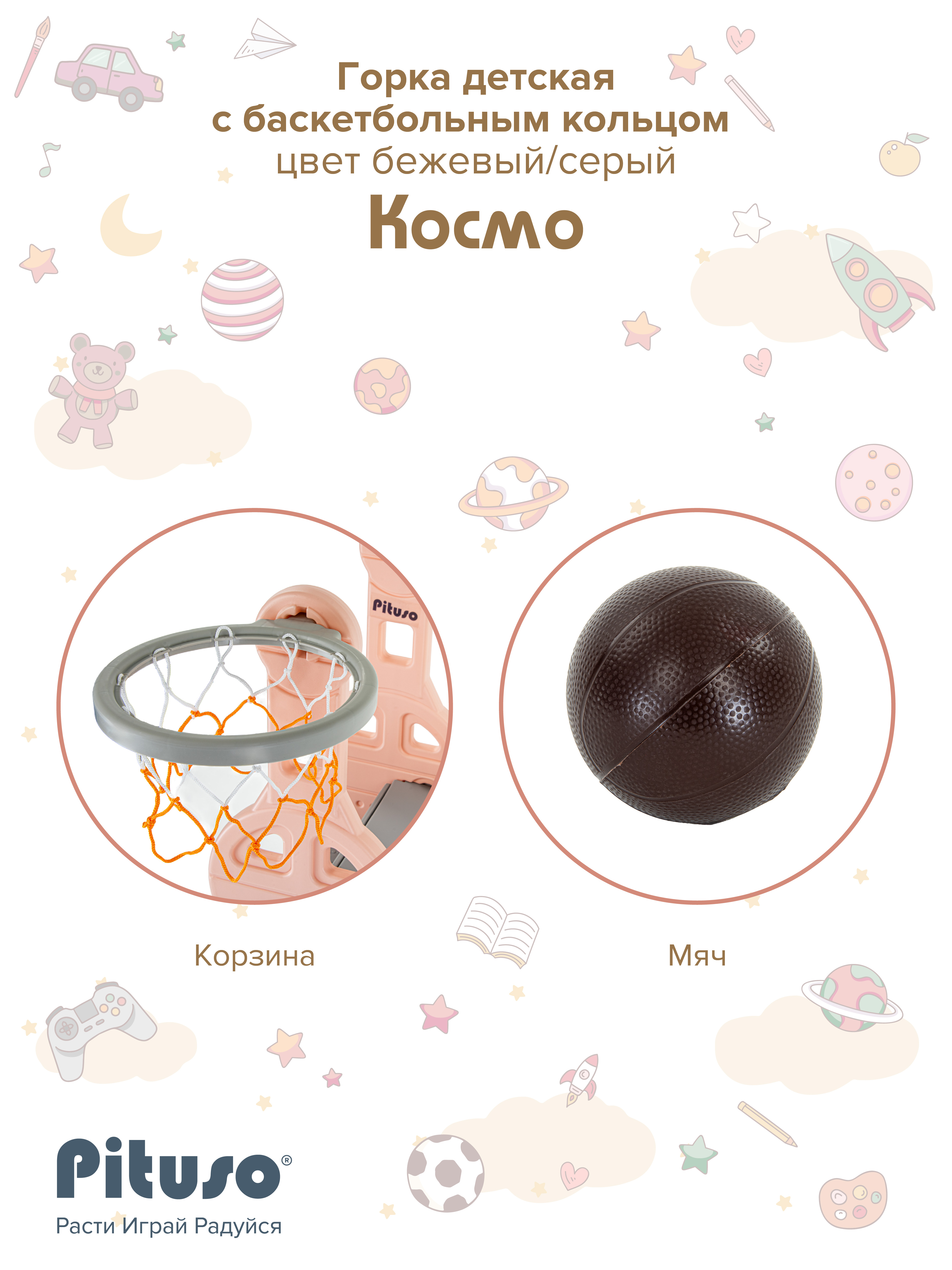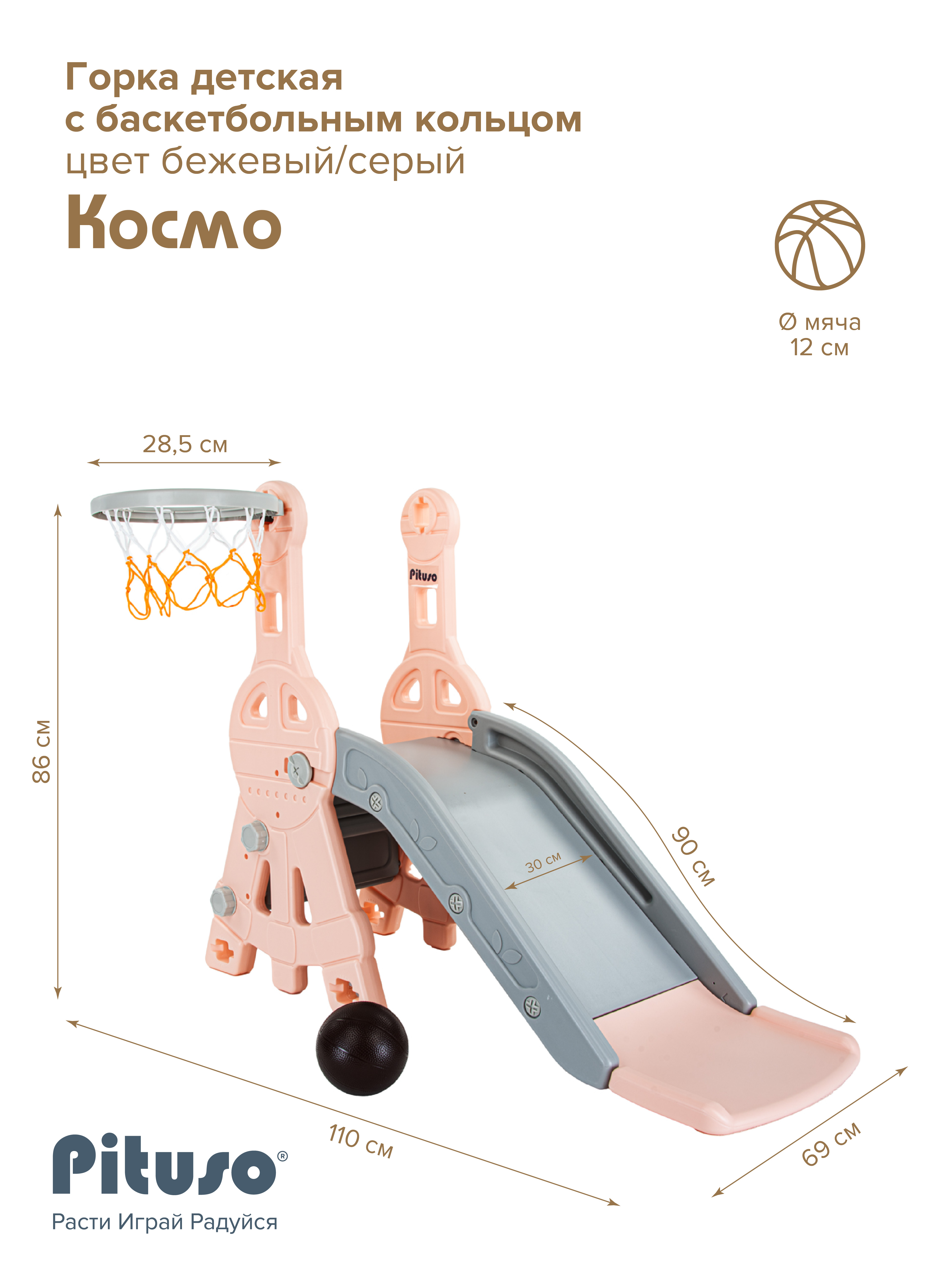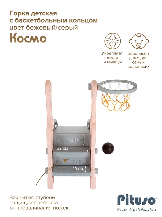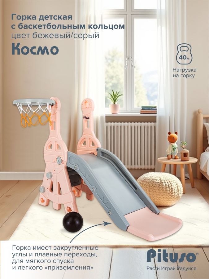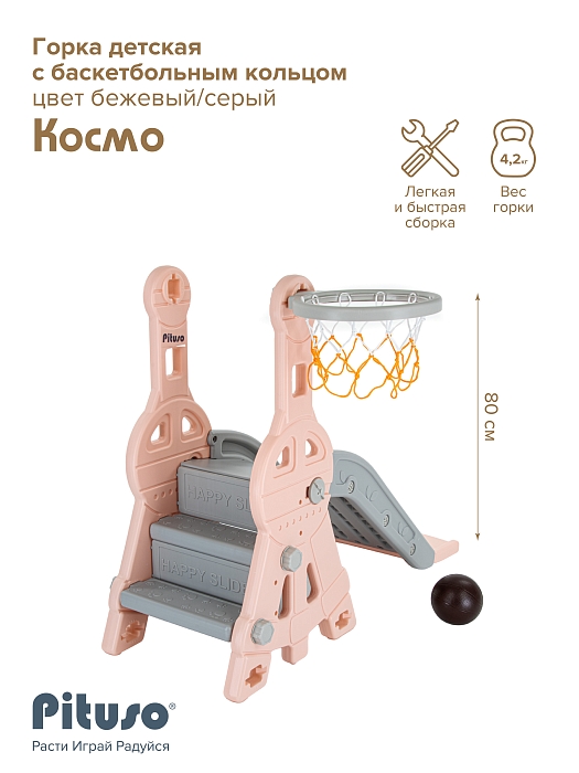 Детская горка Pituso Космо с баскет.кольцом Персиковый/серый