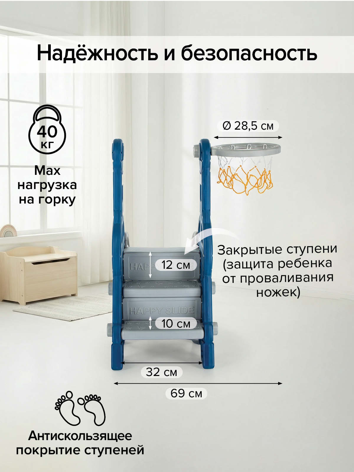 - ширина горки - 40 см (без кольца);