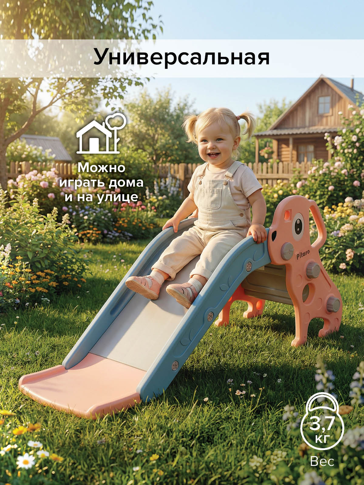 Благодаря размеру примерно 116,5 × 58 × 51 см (с кольцом) горка легко помещается даже в небольшой детской комнате или игровой зоне. Лёгкий вес около 3,7 кг позволяет без особых усилий переносить Мопсика между комнатой, балконом и участком на даче, а при необходимости – убирать конструкцию на хранение, когда игровое время заканчивается.
