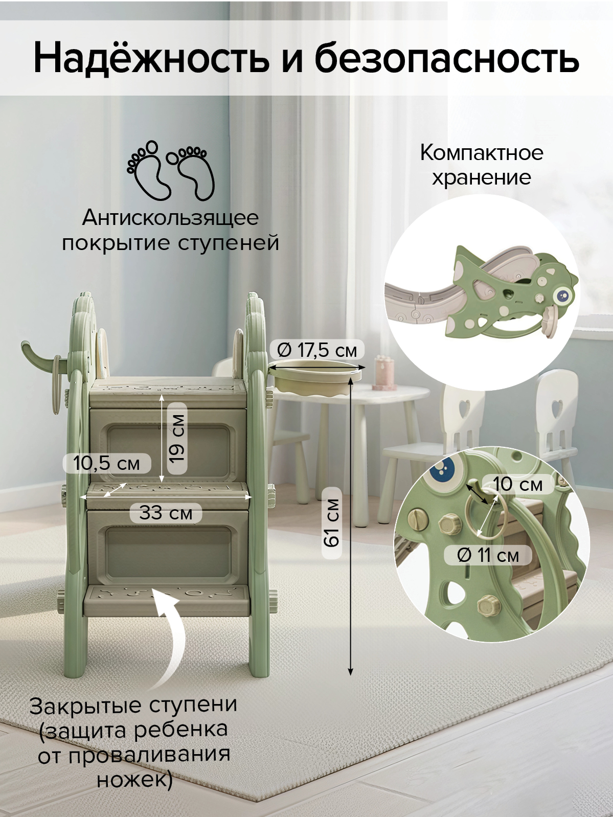 - закрытые ступени (защита ребенка от проваливания ножек)