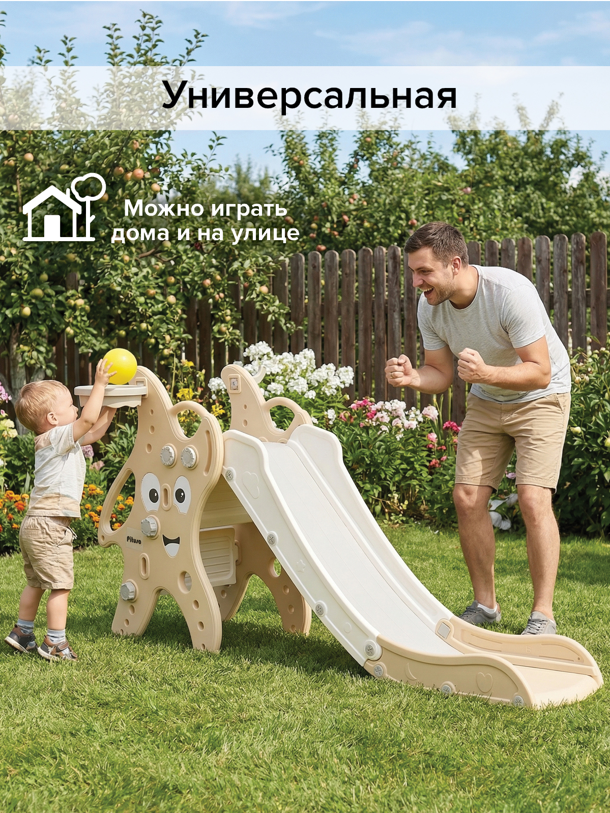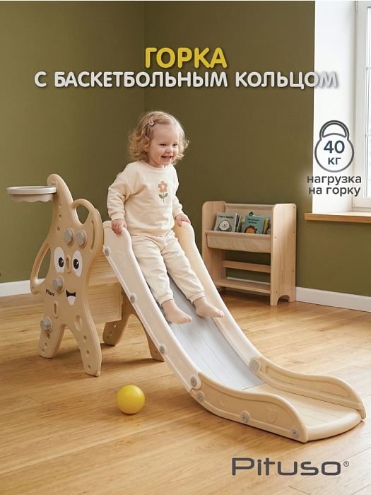 Детская горка Pituso Морская звезда с баскетбольным кольцом – устойчивый игровой комплекс 2‑в‑1, который подойдёт для квартиры, дачи и игр на улице летом. Длинный скат, широкое основание и встроенное баскетбольное кольцо позволяют ребёнку активно двигаться, кататься и бросать мяч в кольцо, превращая горку в мини‑площадку дома и на свежем воздухе.