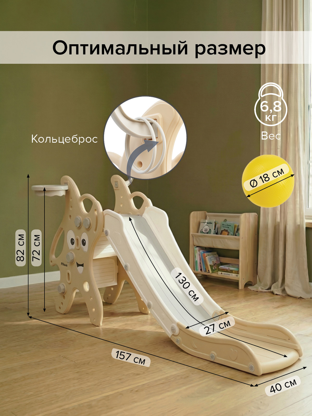 - Назначение: катание с горки, броски мяча в кольцо, активные игры и развитие координации;