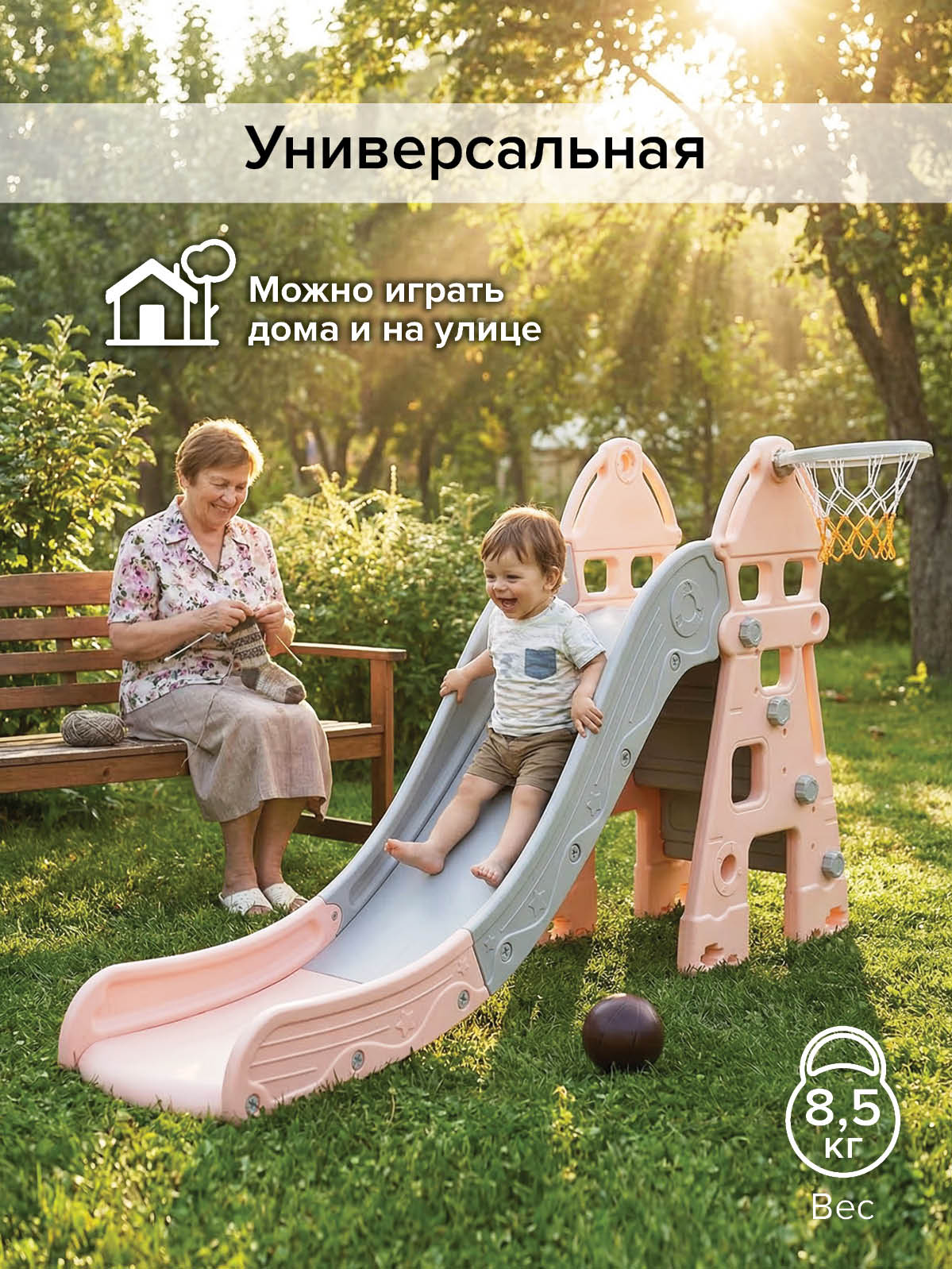 - Назначение: активные игры, катание с горки и броски мяча в кольцо, использование в квартире, на даче и во дворе;