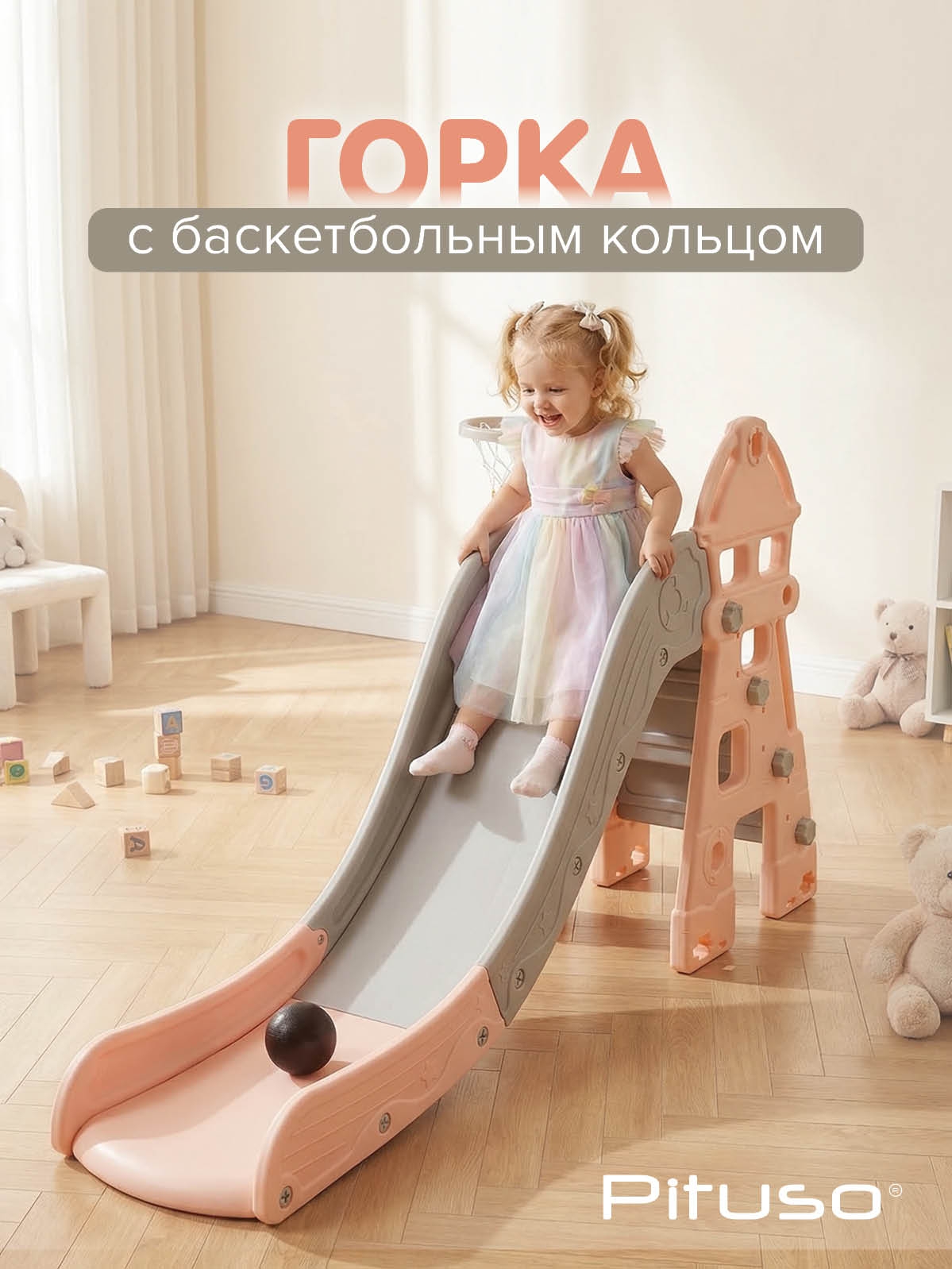 Горка рассчитана на максимальную нагрузку до 40 кг, что подходит для большинства дошкольников и младших школьников. Встроенное баскетбольное кольцо с мячом помогает разнообразить сценарии игры: ребёнок может по очереди кататься, забрасывать мяч в корзину и придумывать свои вариации соревнований.