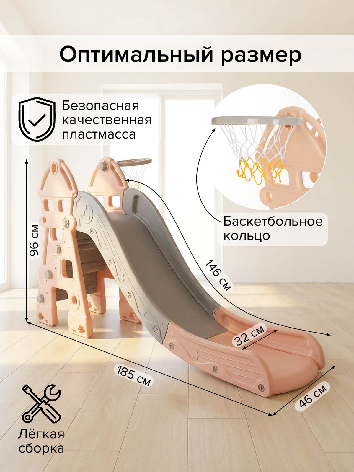 Размер горки около 185 × 46 × 96 см делает её полноценным игровым центром дома: достаточно места для динамичного спуска, но конструкцию всё ещё можно разместить вдоль стены в детской комнате или игровой зоне. На даче или во дворе горка станет альтернативой площадке: ребёнок может кататься и бросать мяч в кольцо, оставаясь под присмотром взрослых.