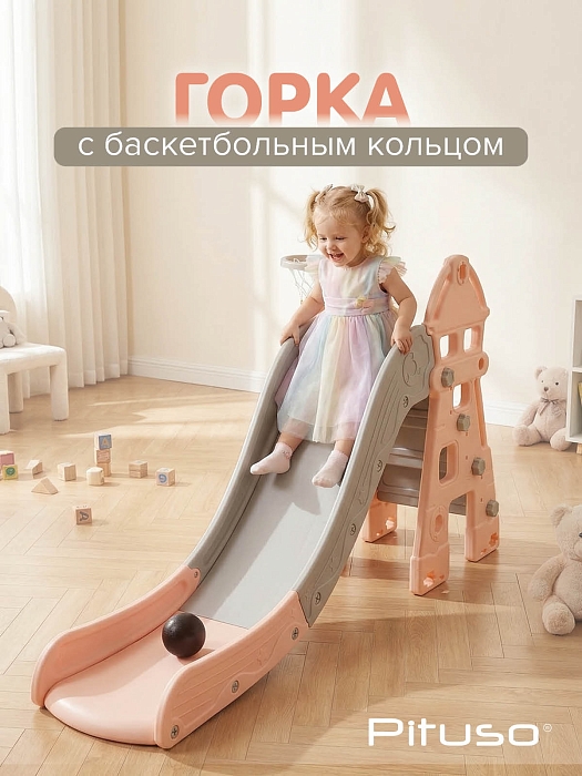 Детская горка Pituso Замок с баскетбольным кольцом – крупная устойчивая горка для активных игр, которая подходит и для квартиры, и для дачи, и для игр на улице в тёплое время года. Продуманная форма и длинный скат позволяют ребёнку почувствовать «настоящую» горку, а баскетбольное кольцо с мячом дополняет комплекс ещё одним видом активности.