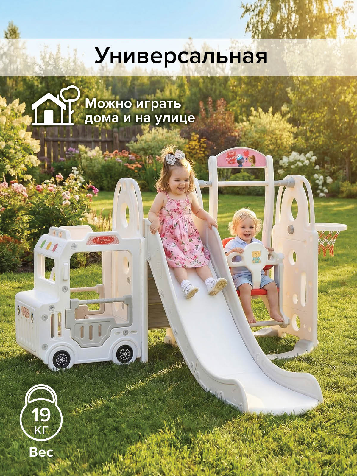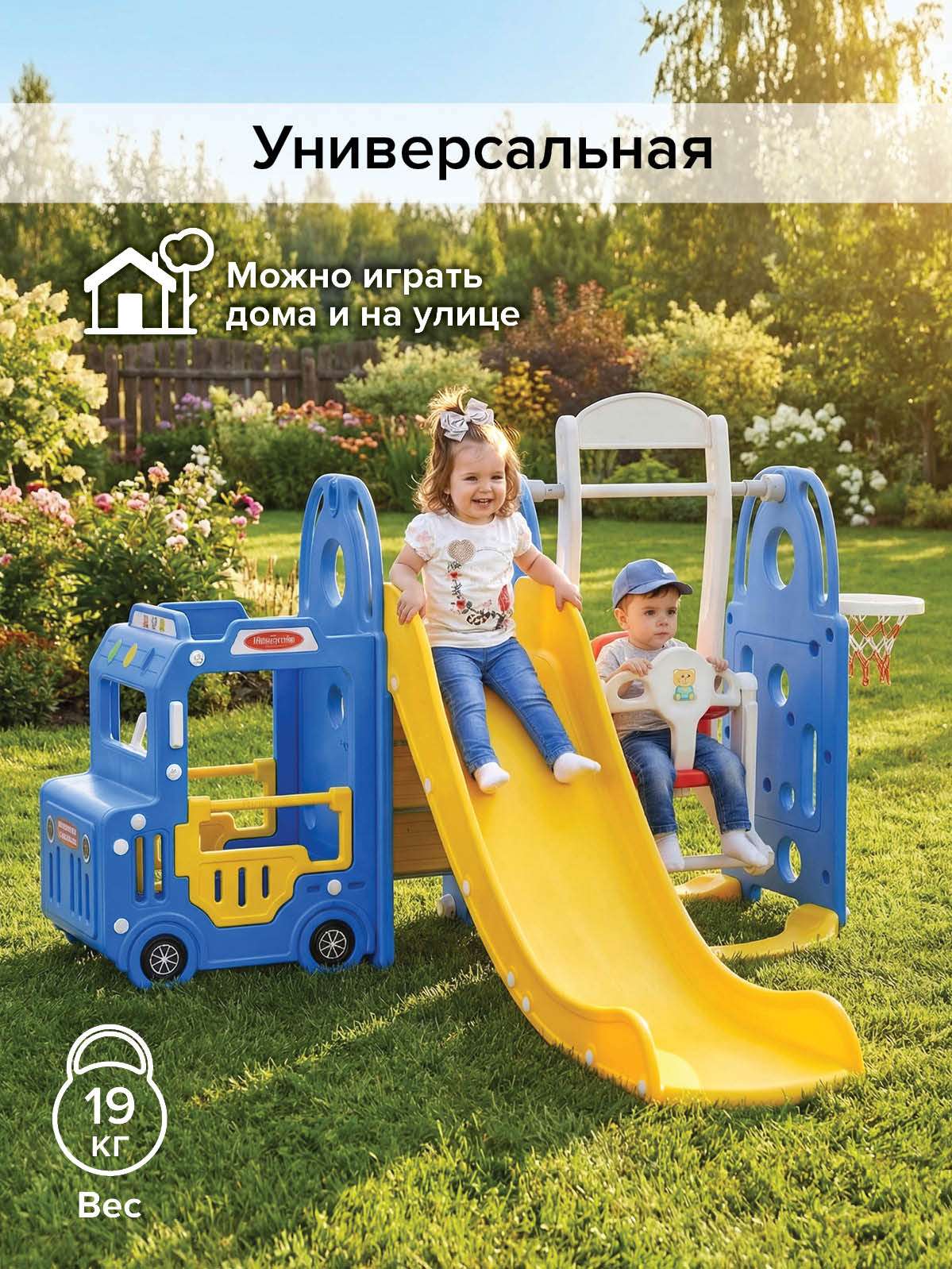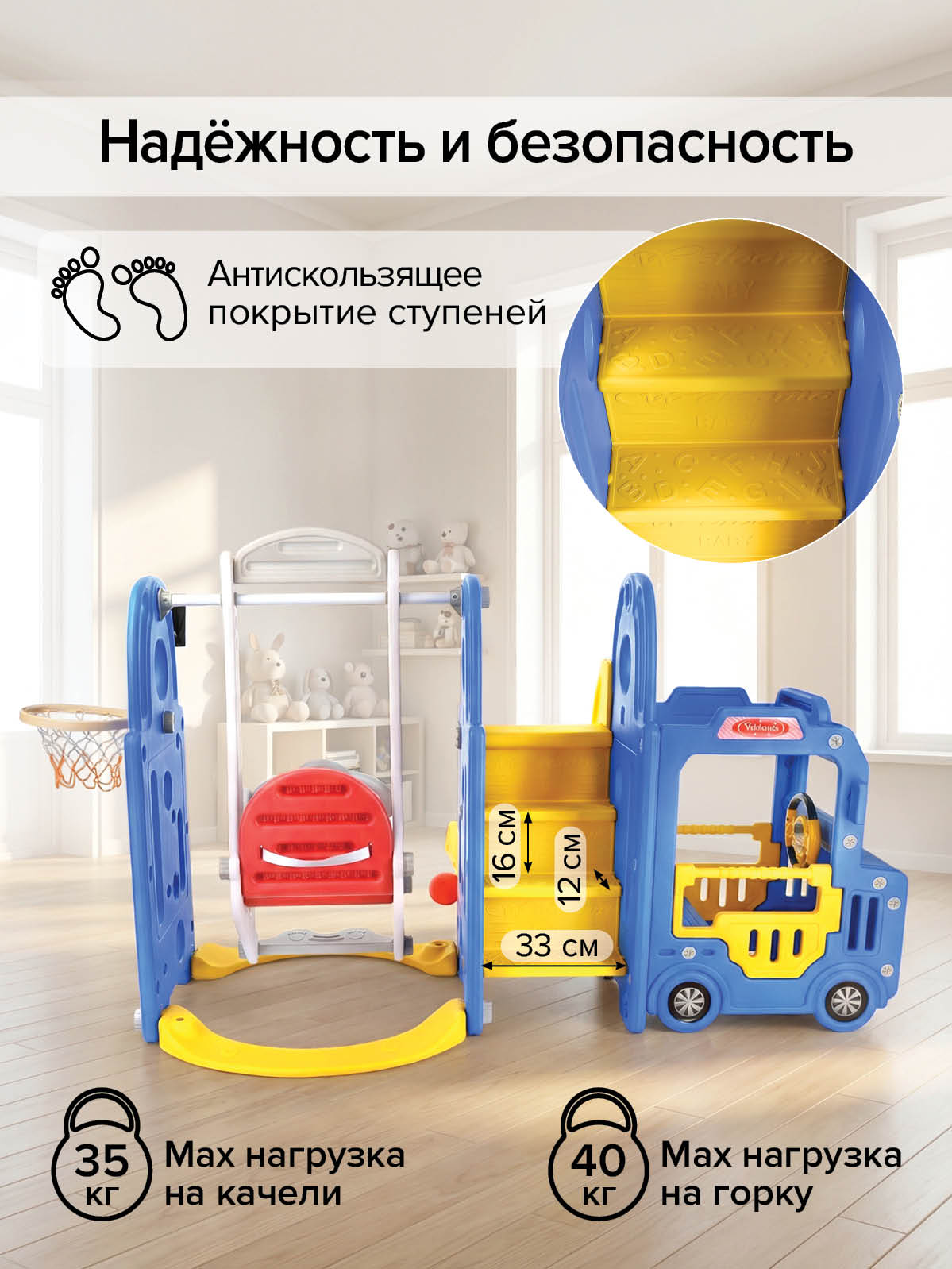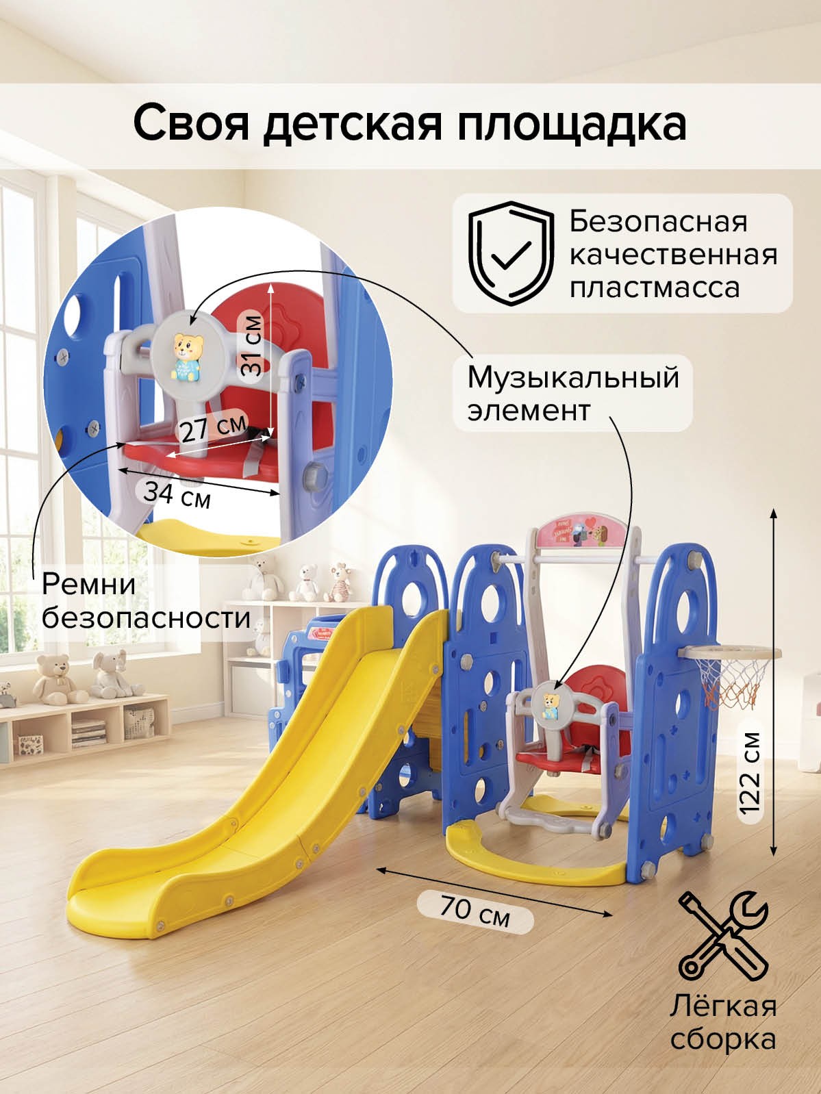 - Тип: детский игровой комплекс 3‑в‑1 (горка, качели, баскетбольное кольцо, кабина‑машинка) для квартиры, дачи и игр на улице;
