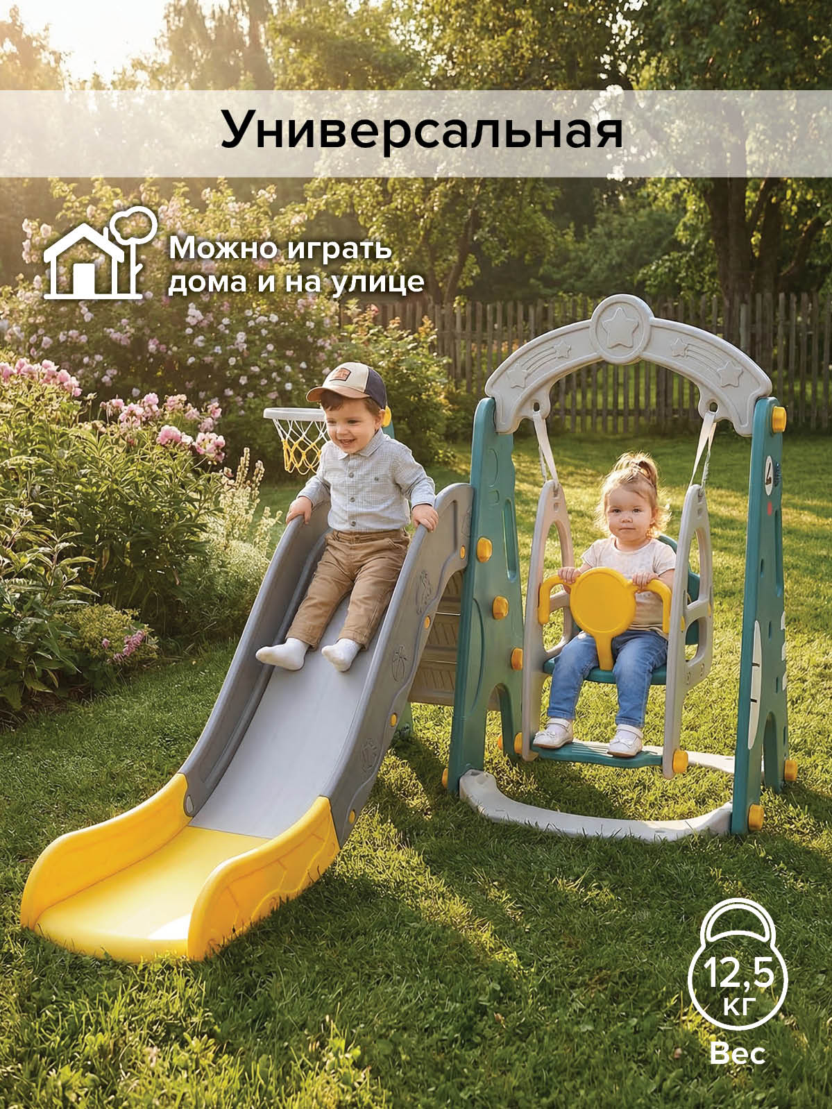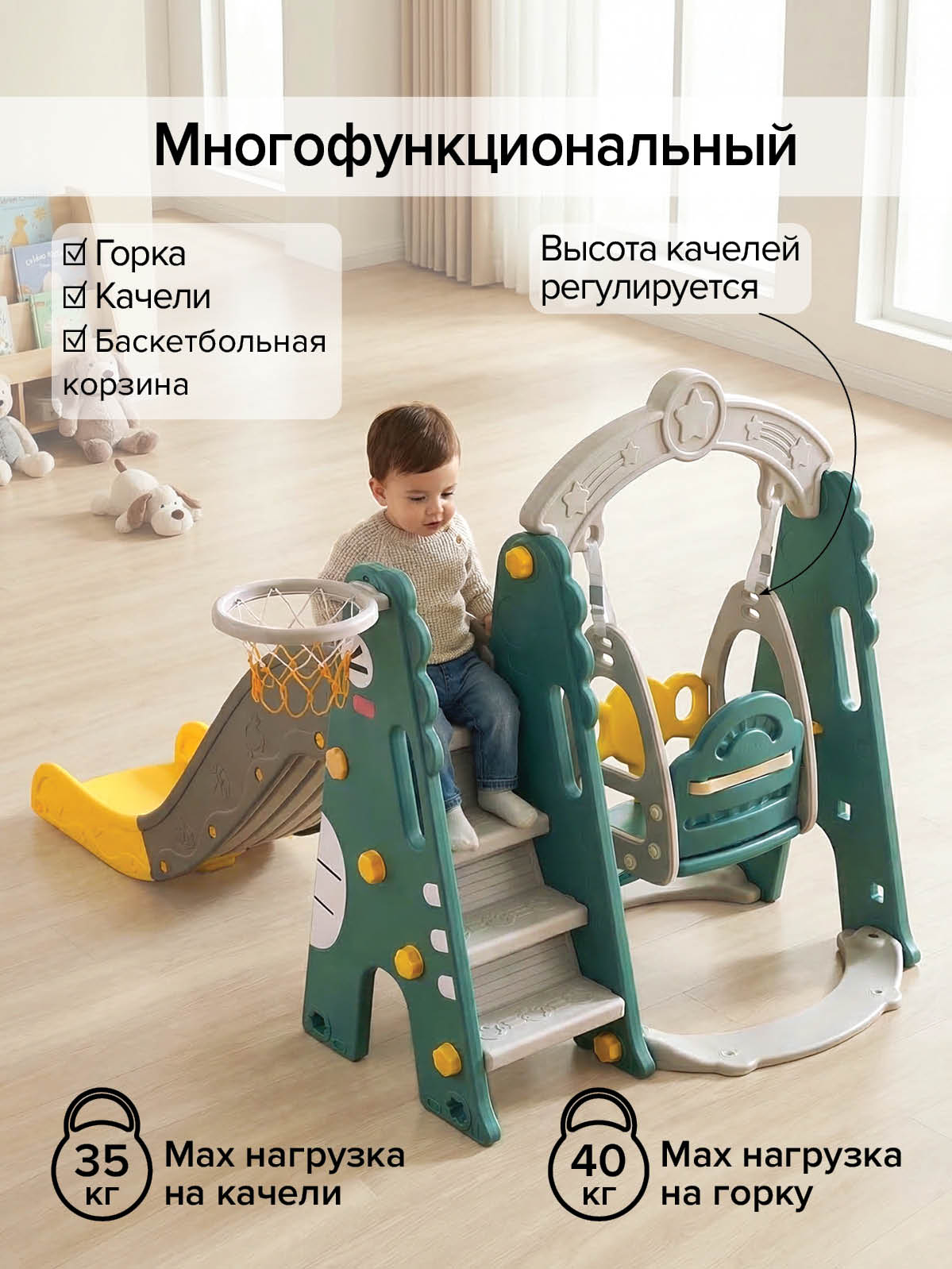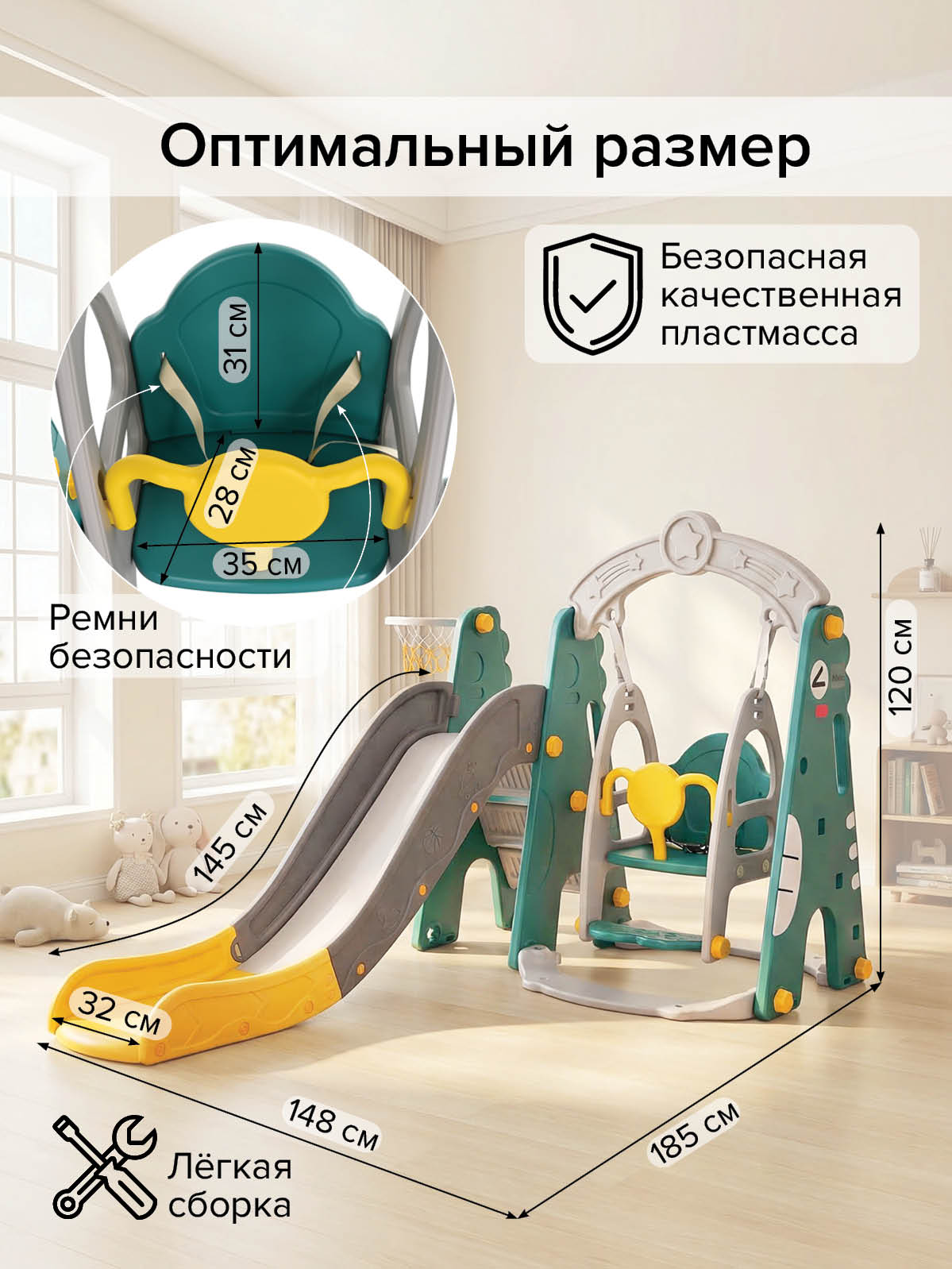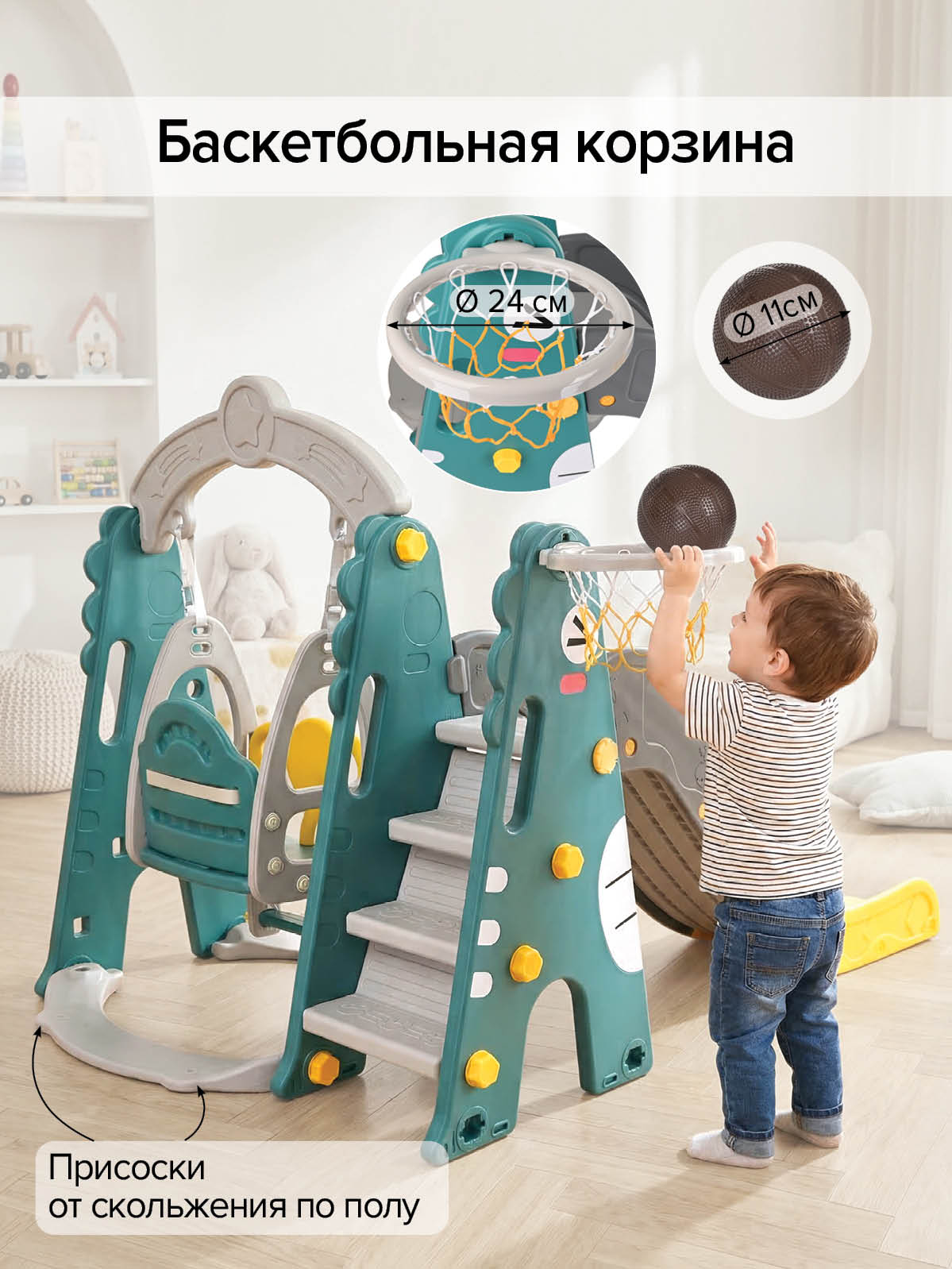 - Тип: детский игровой комплекс 3‑в‑1 (горка, качели, баскетбольное кольцо);