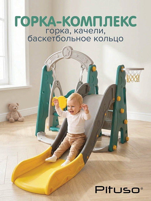 Горка‑комплекс Pituso Динозавр – многофункциональный игровой центр 3 в 1 для дома и дачи, который объединяет горку, качели и баскетбольное кольцо. Такая конструкция помогает организовать безопасные подвижные игры, развивает координацию, ловкость и моторику, а также экономит пространство, заменяя сразу несколько отдельных снарядов.