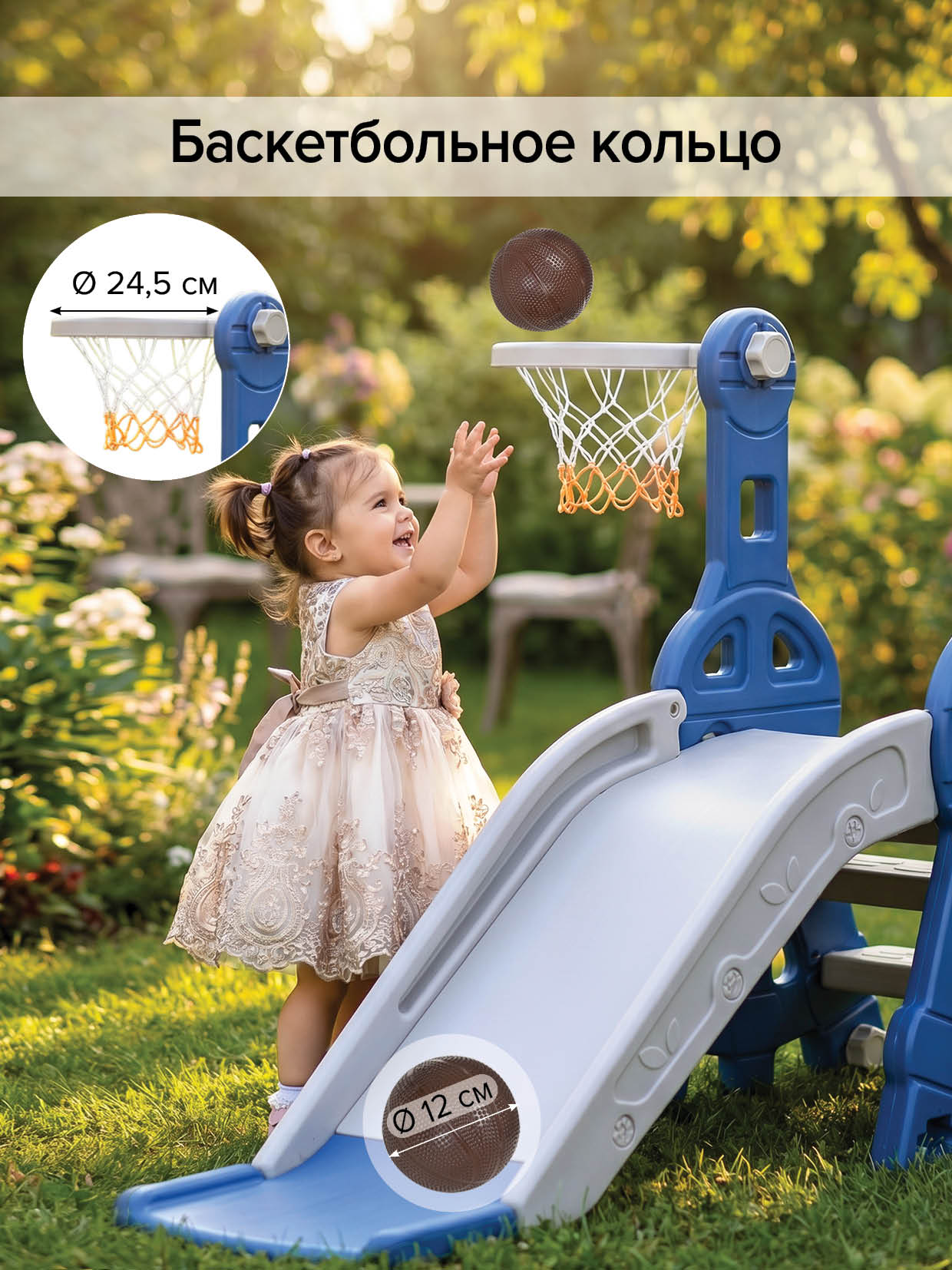 - Тип: детский игровой комплекс 3‑в‑1 (горка, качели, баскетбольное кольцо);