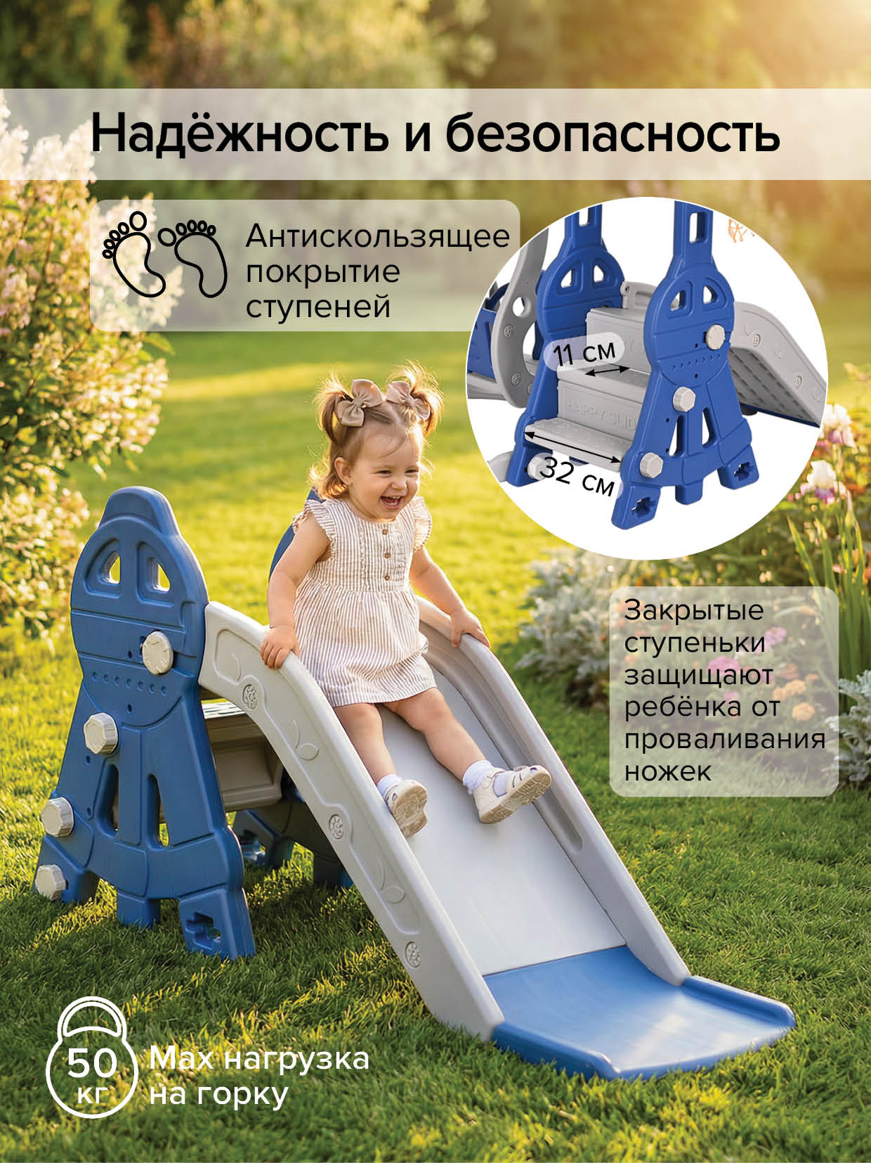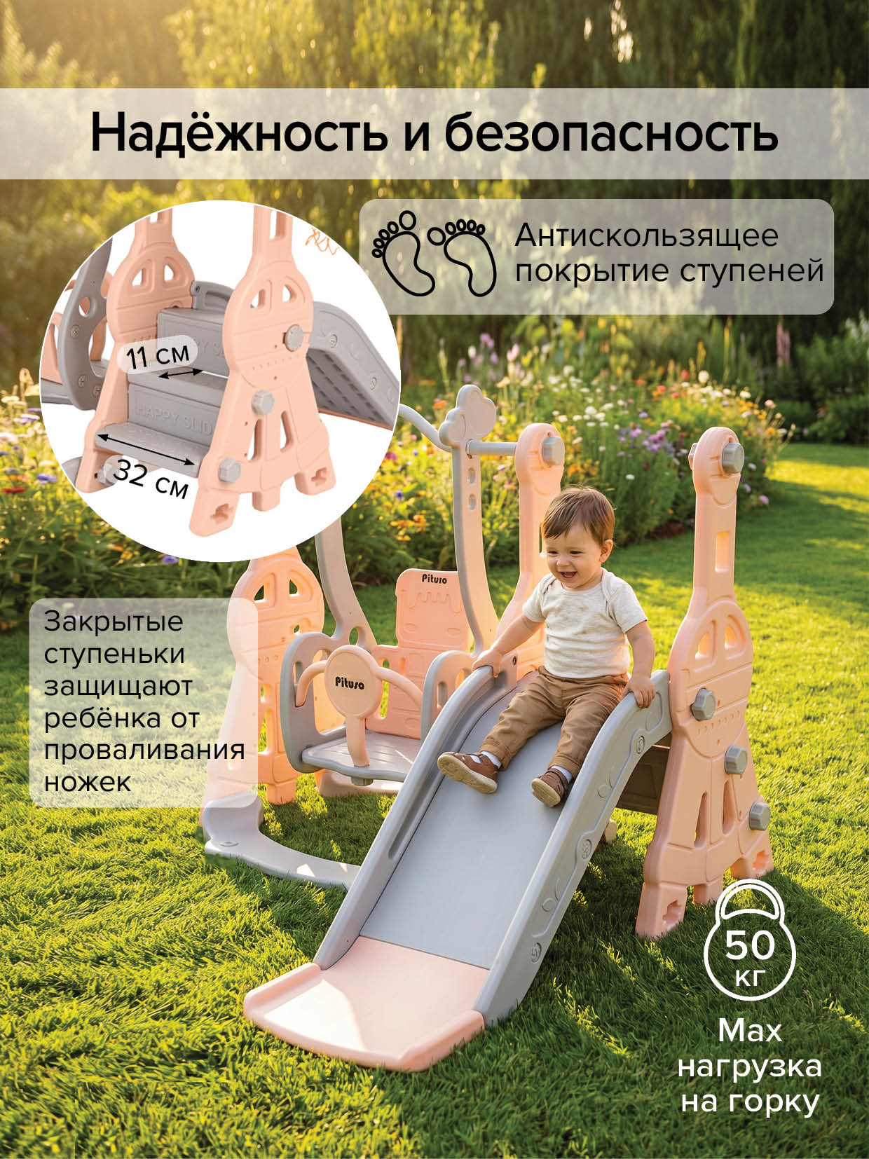 Игровой комплекс рассчитан на регулярное использование дома и подходит для активных детей: горка выдерживает нагрузку до 50 кг, а качели – до 35 кг, что позволяет пользоваться комплексом несколько лет подряд по мере роста ребёнка. Конструкция остаётся устойчивой на ровной поверхности, при этом элементы легко моются и не требуют сложного ухода.
