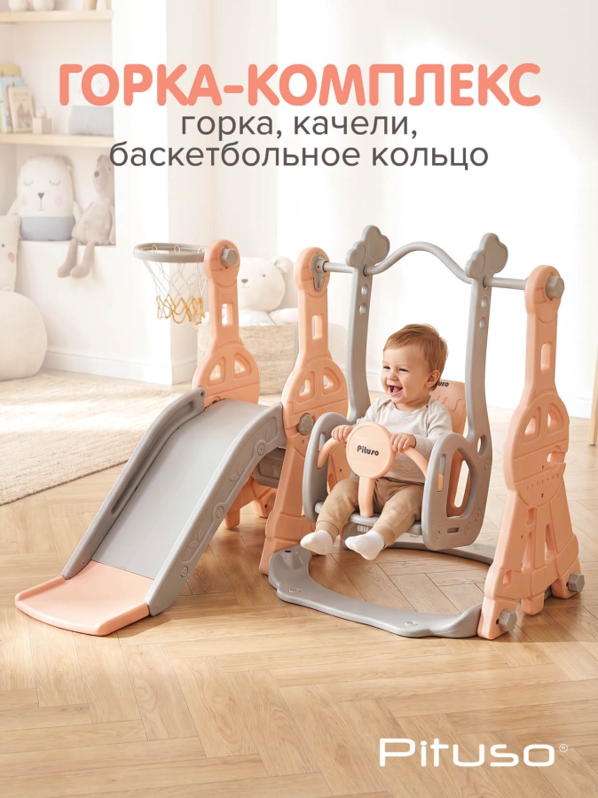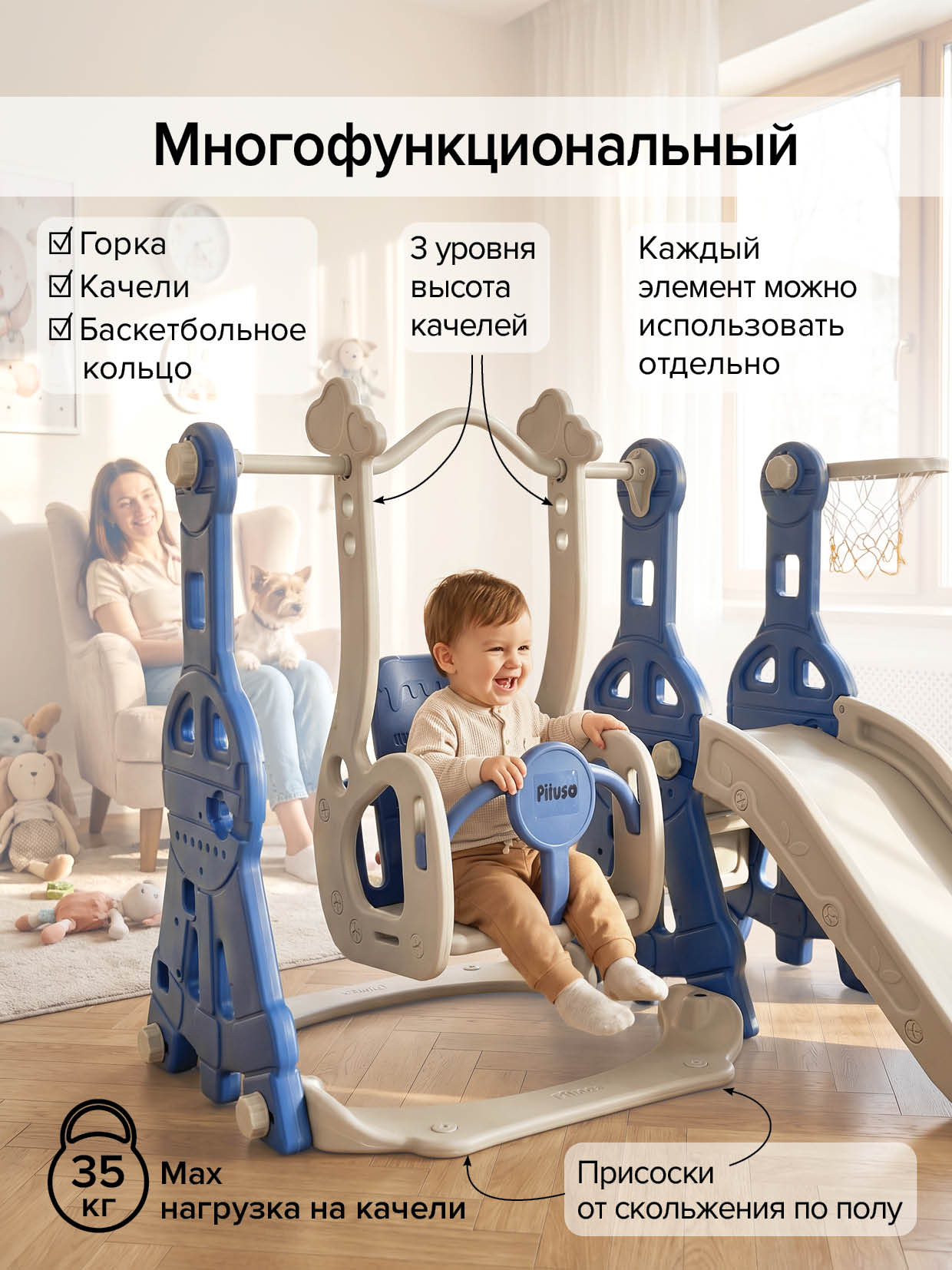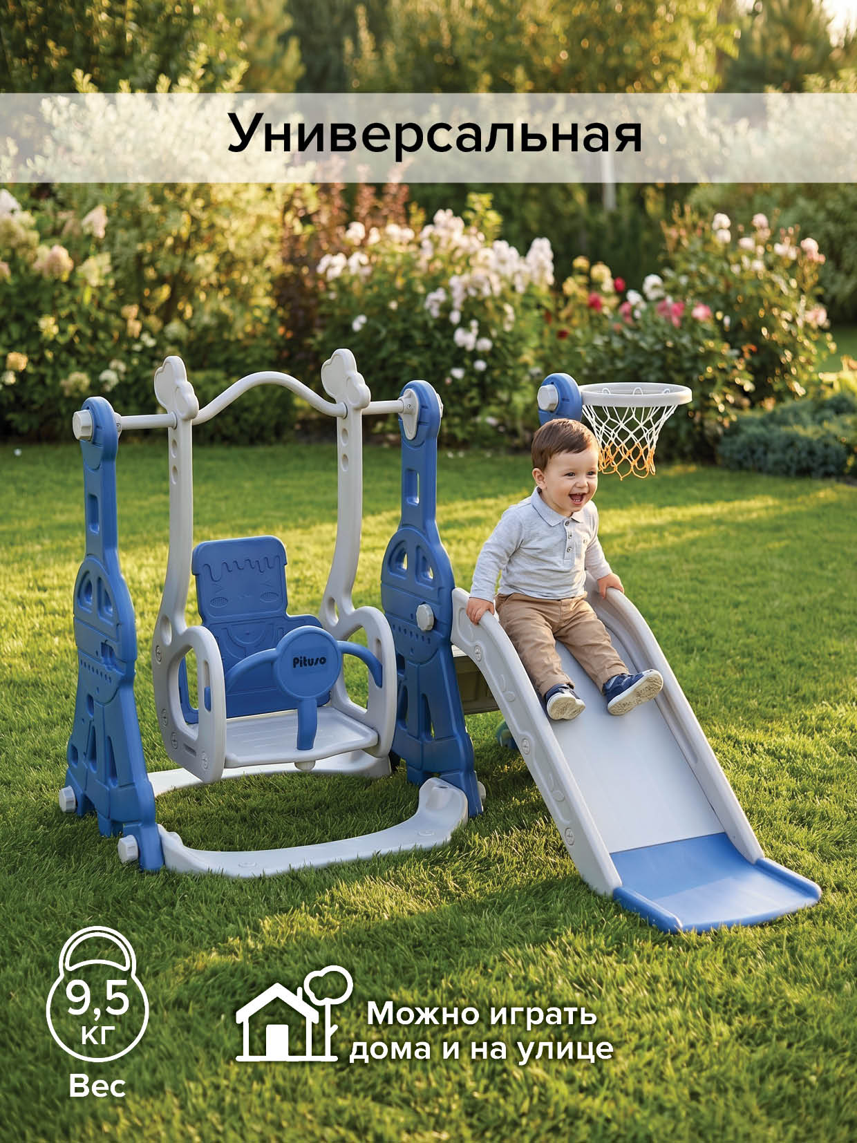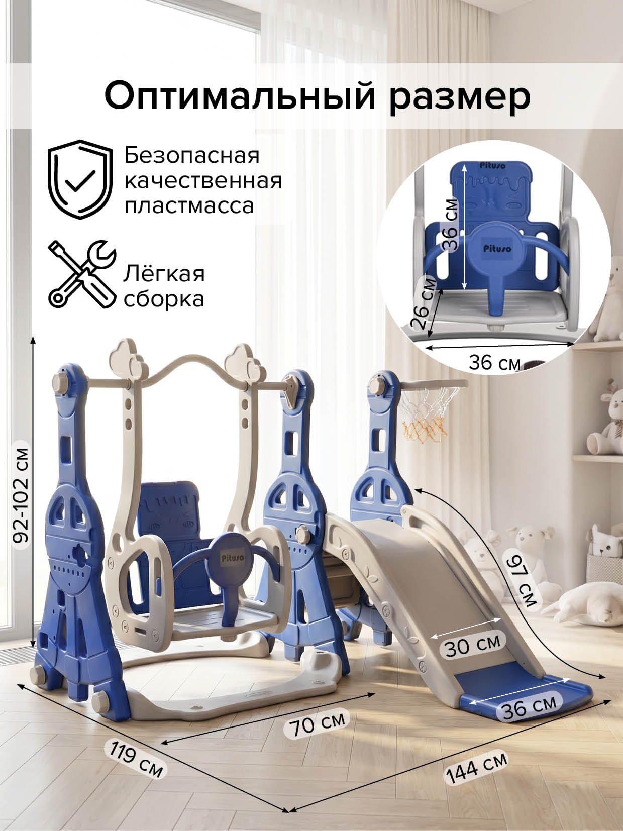 Pituso Космо 3 в 1 – универсальный детский игровой комплекс, объединяющий горку, качели и баскетбольное кольцо для активных развлечений дома. Эта модель идеально подходит для развития моторики, координации и физической формы малышей, предлагая разнообразные занятия в одном компактном устройстве.