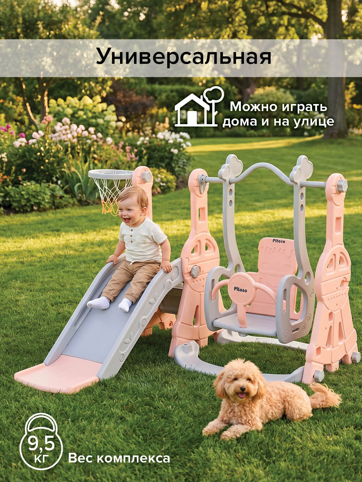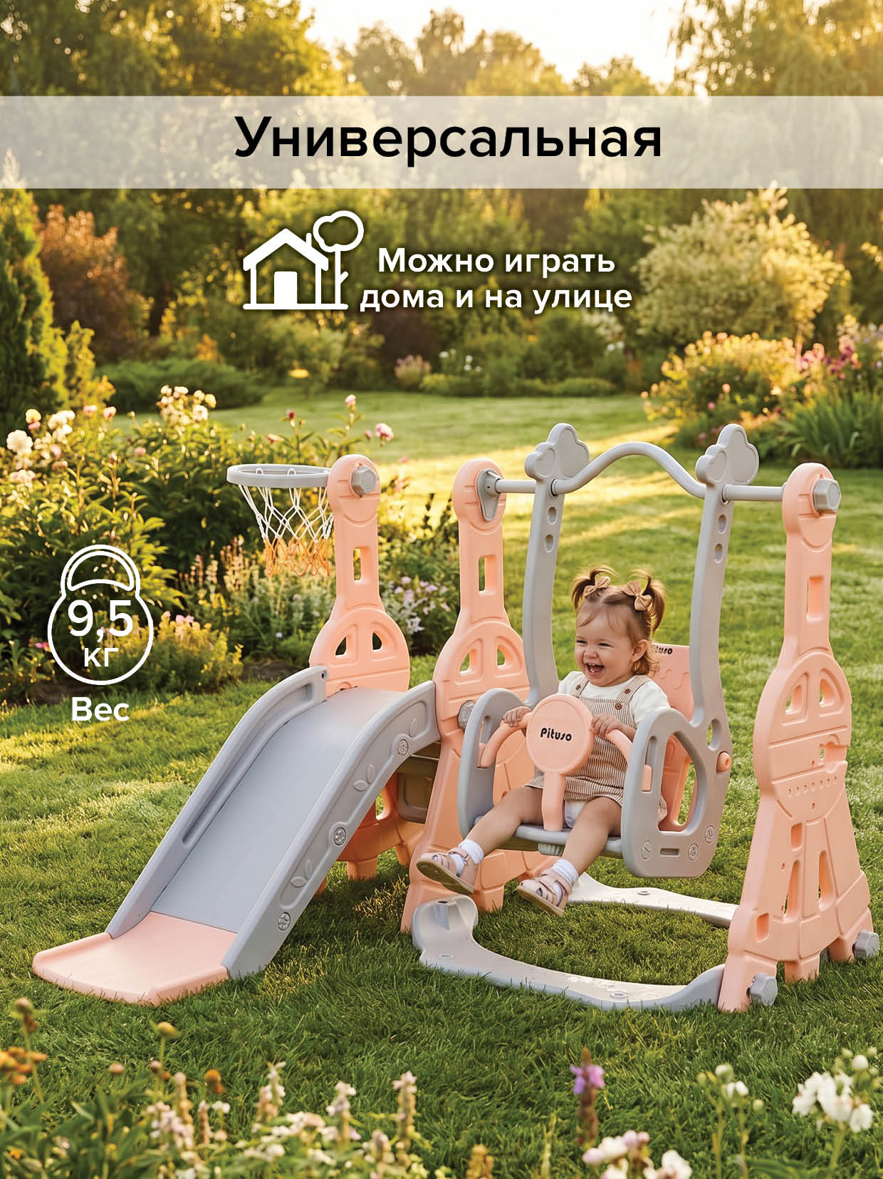 Универсальность и безопасность – главный плюс Pituso Космо: конструкция включает закрытые ступеньки, предотвращающие подворачивание ножек, и прочные элементы для надежной игры. Родители оценят простоту сборки без специальных инструментов, а дети – возможность спускаться по горке, раскачиваться на качелях и забрасывать мячи в кольцо с мячом в комплекте.