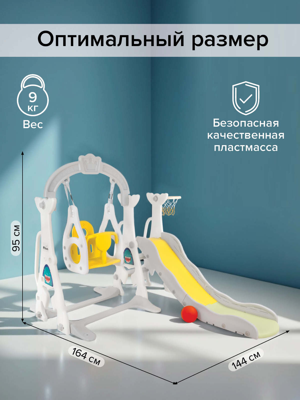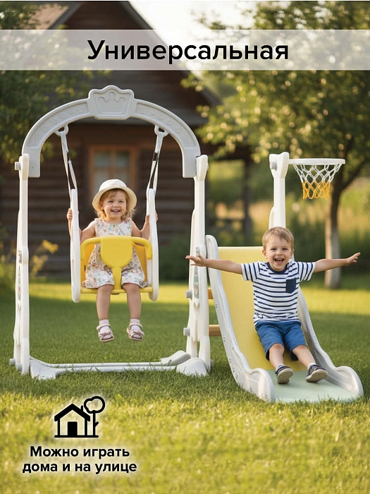 Комплектация: пластиковая горка, качели, кольцо баскетбольное (1 шт.), мяч (1 шт.).