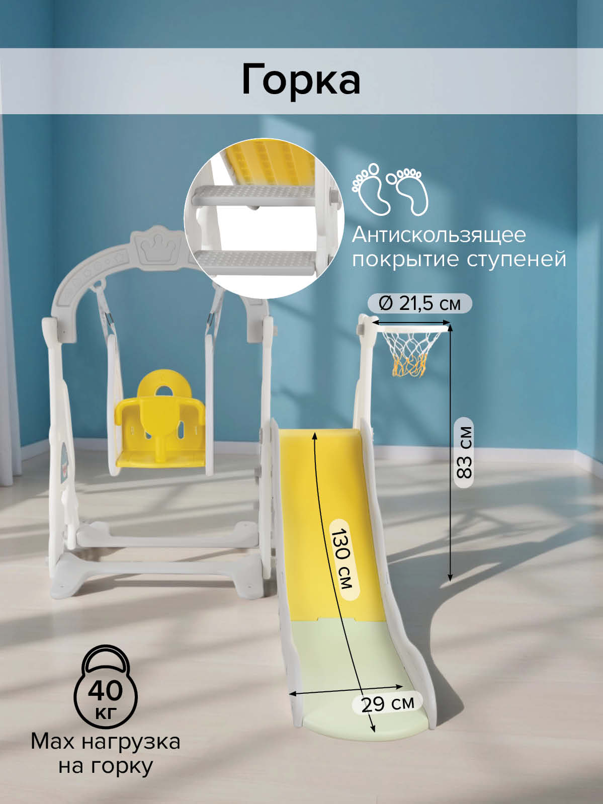 - максимальная нагрузка на горку – 40 кг, на качели – 35 кг;