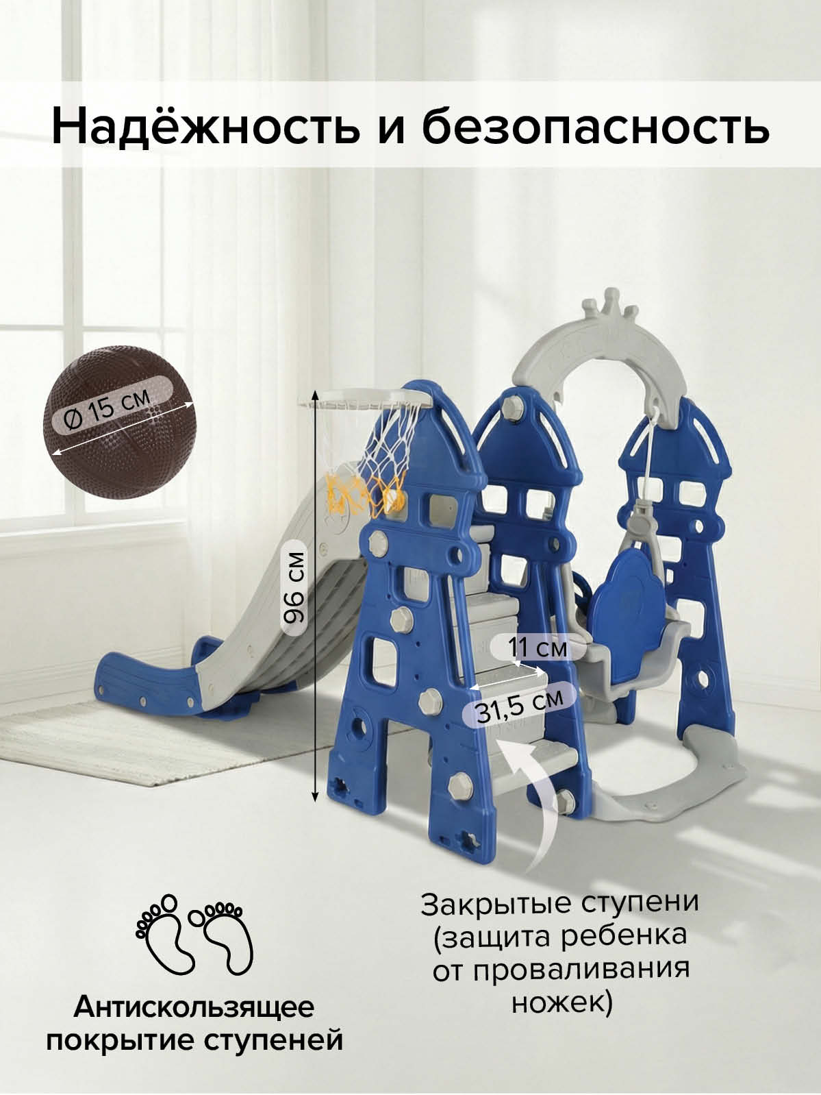 - В комплекте: горка, мячик, баскетбольное кольцо, качели