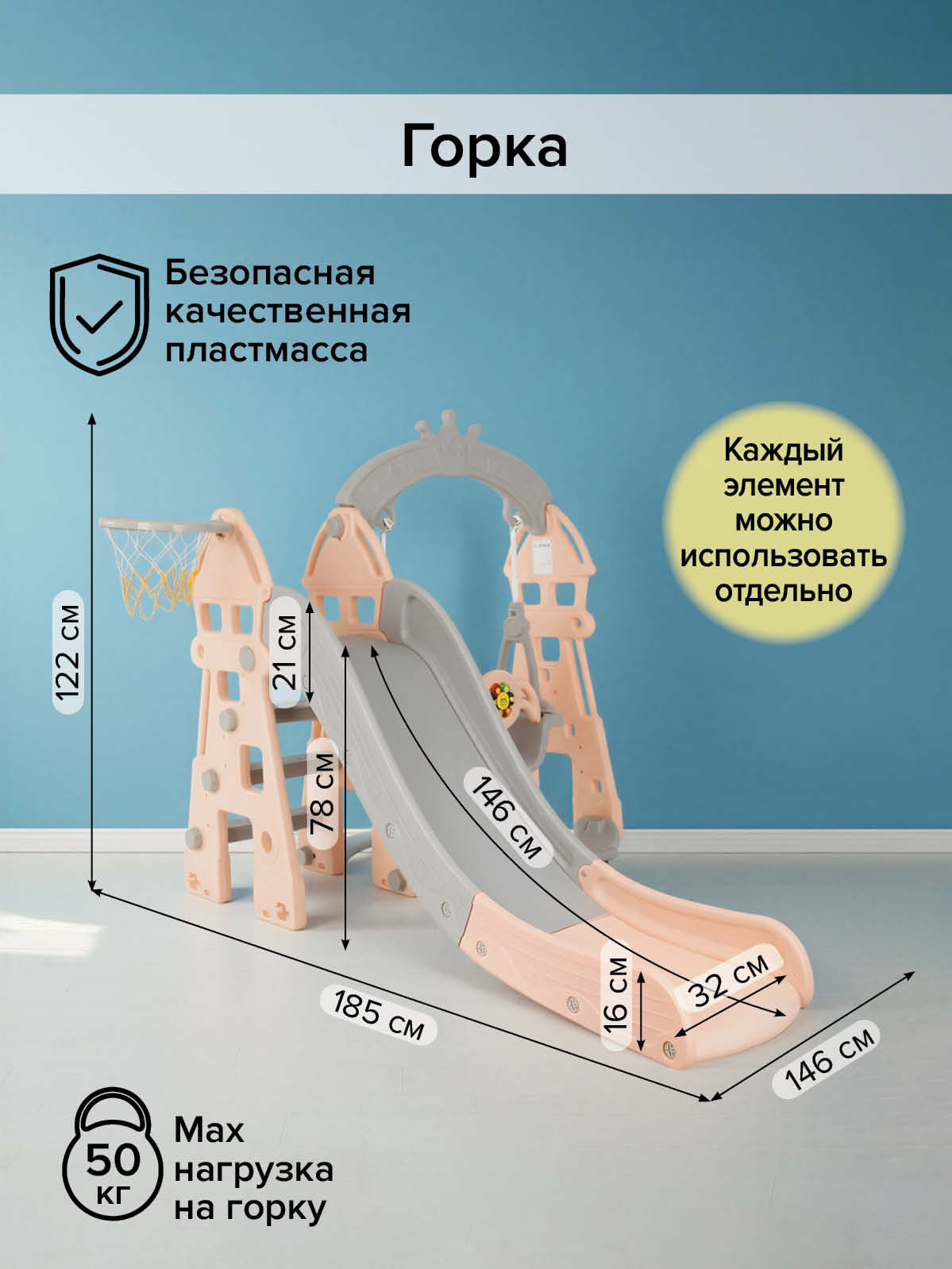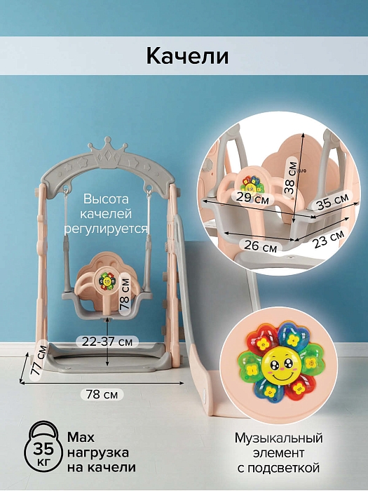 - В комплекте: горка, мячик, баскетбольное кольцо, качели