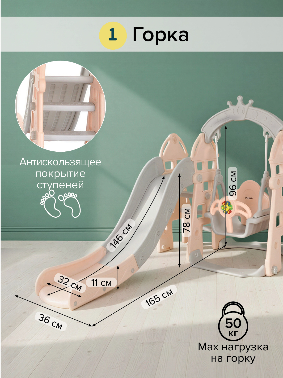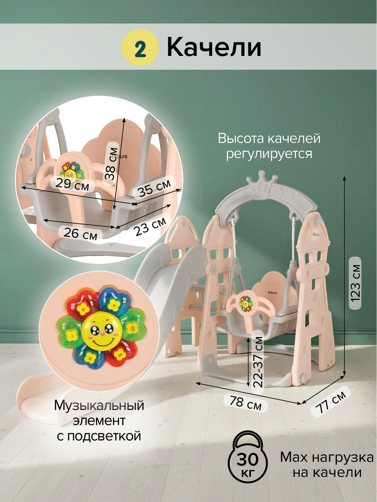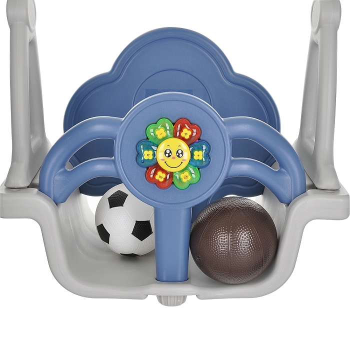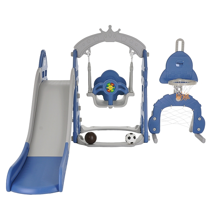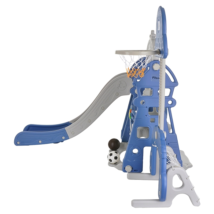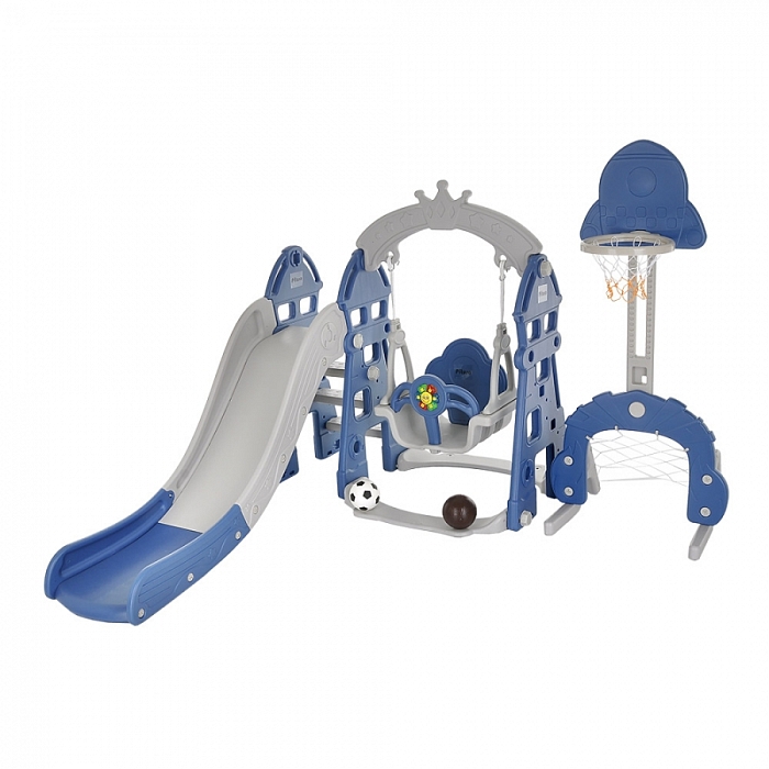 - В комплекте: горка, мячик, баскетбольное кольцо, качели
