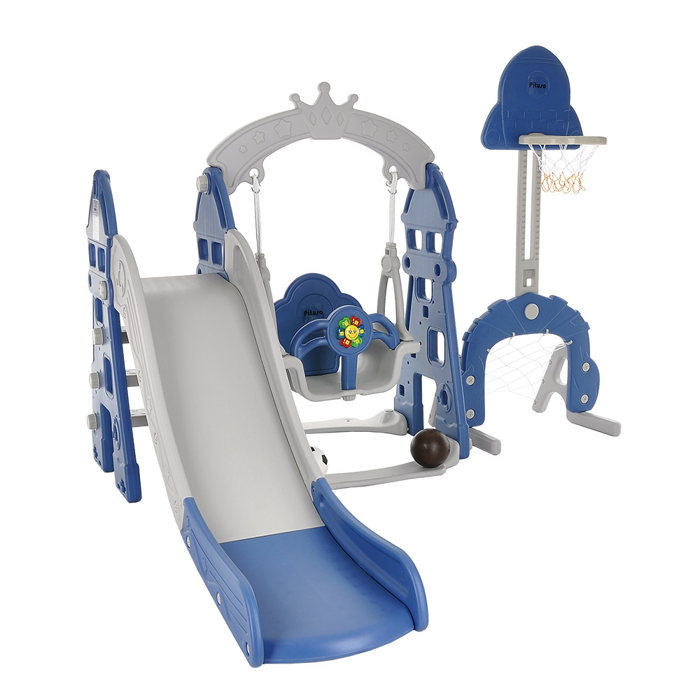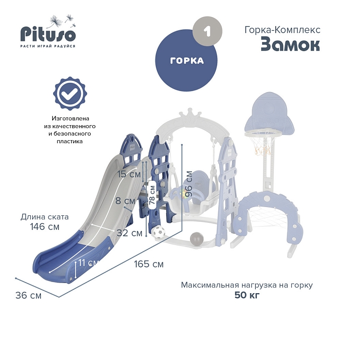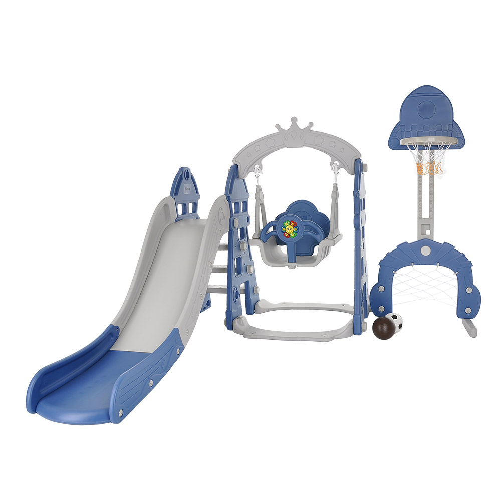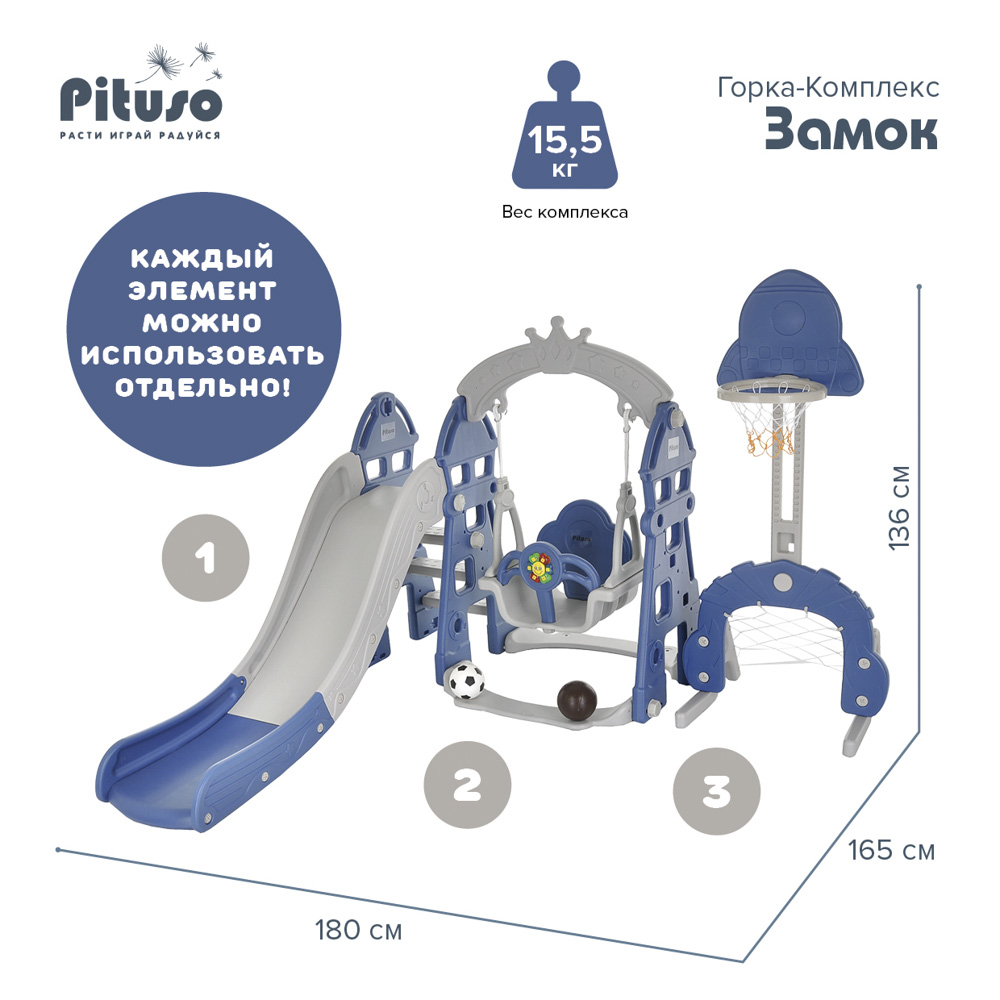 - В комплекте: горка, мячик, баскетбольное кольцо, качели