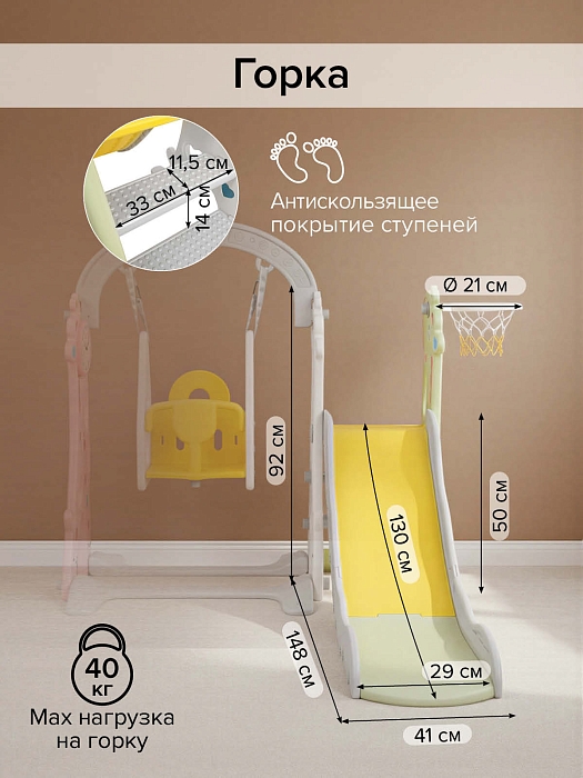 Максимально безопасная продуманная конструкция, ненавязчивый дизайн, возможность раздельного использования делают ее лучшим подарком. Идеально подходит для семей с несколькими детьми, в том числе разных возрастов. Пока младший счастливо качается в качелях, старший радуется на горке или забрасывает мяч в баскетбольное кольцо.