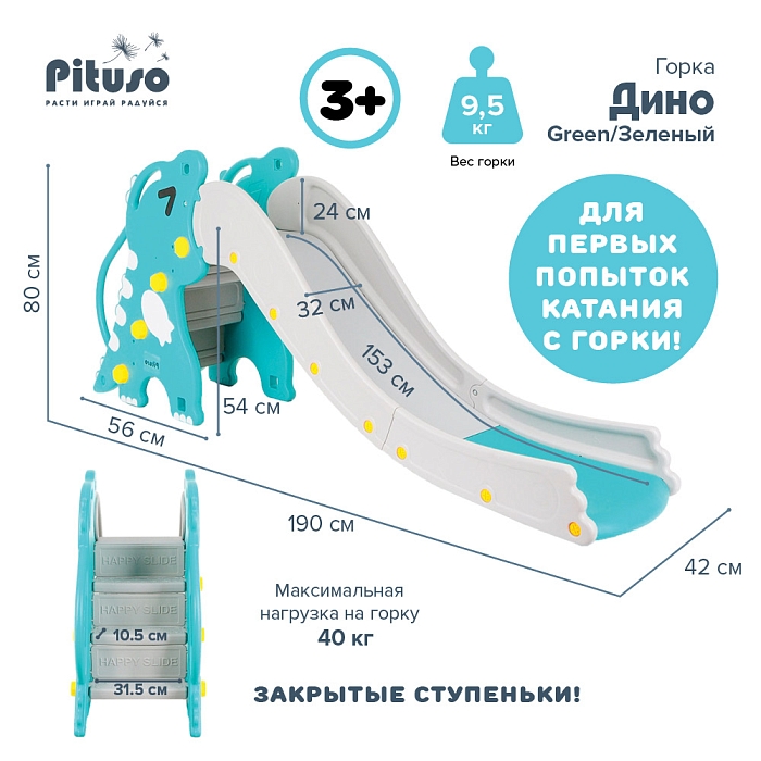 Детская горка Pituso Дино Green / Зеленый (190*32*80h)
