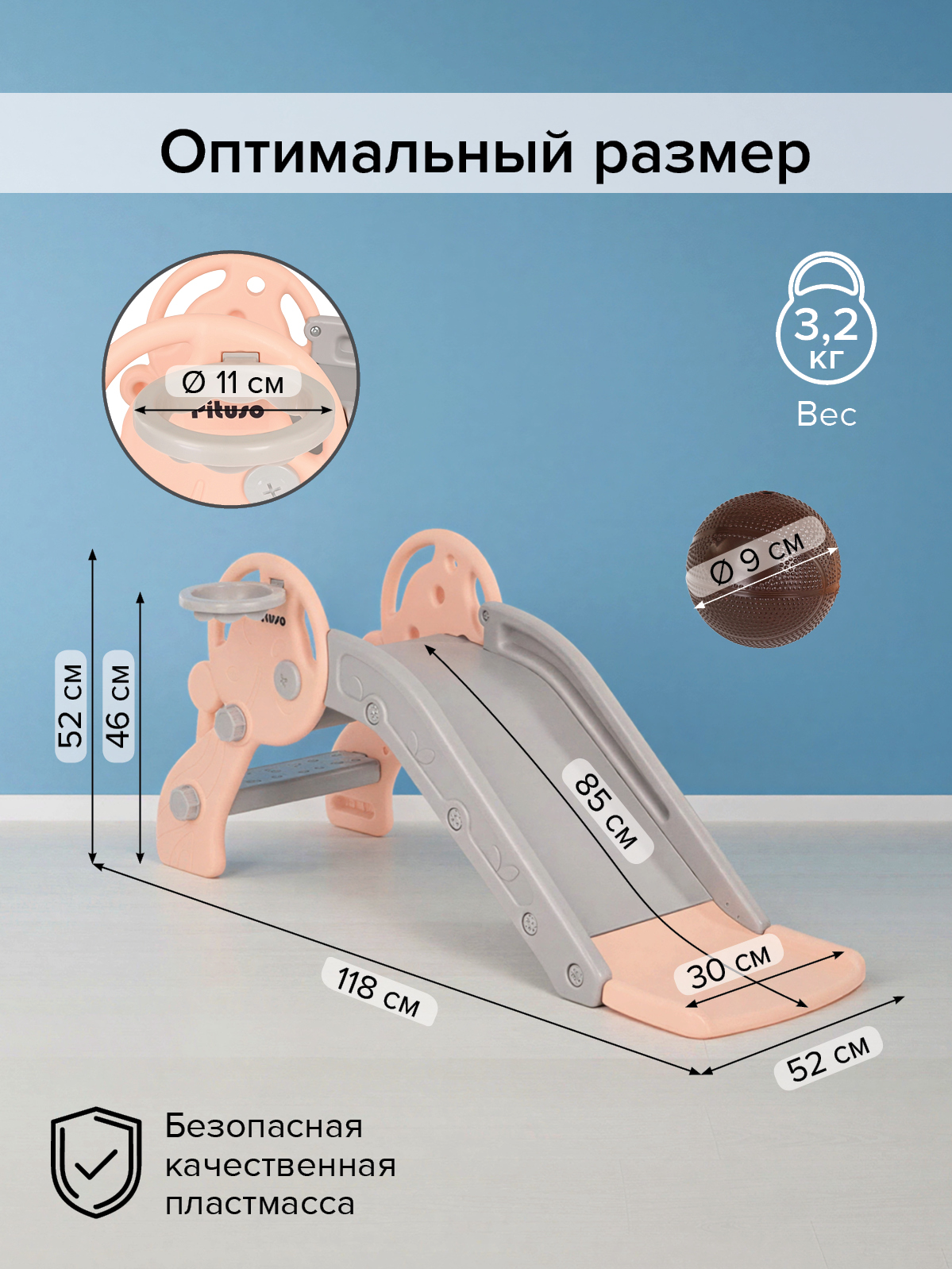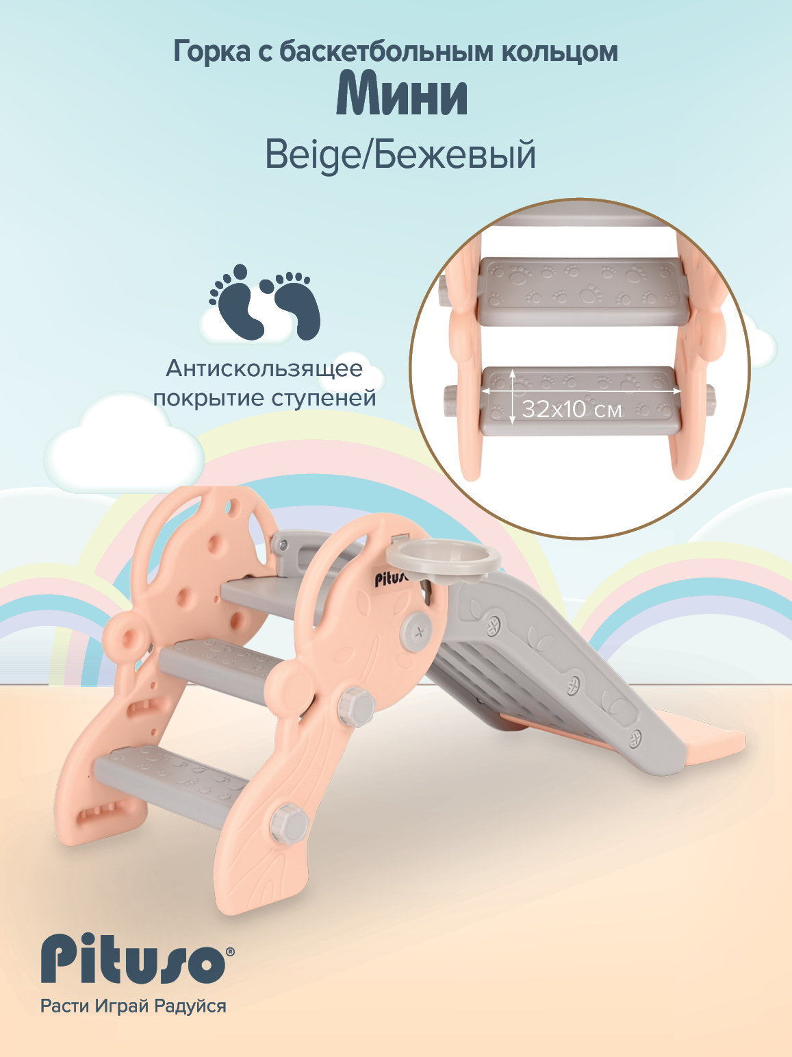 Горка Мини - милая модель для самых маленьких детей. Высота горки всего 52 см. На горку ведут всего две ступеньки. Благодаря компактным размерам отлично подойдет даже для небольшой комнаты. А ее легкий вес позволит перемещать ее без особых усилий. Горка Pituso Мини отлично подойдет для первых попыток катания с горки!