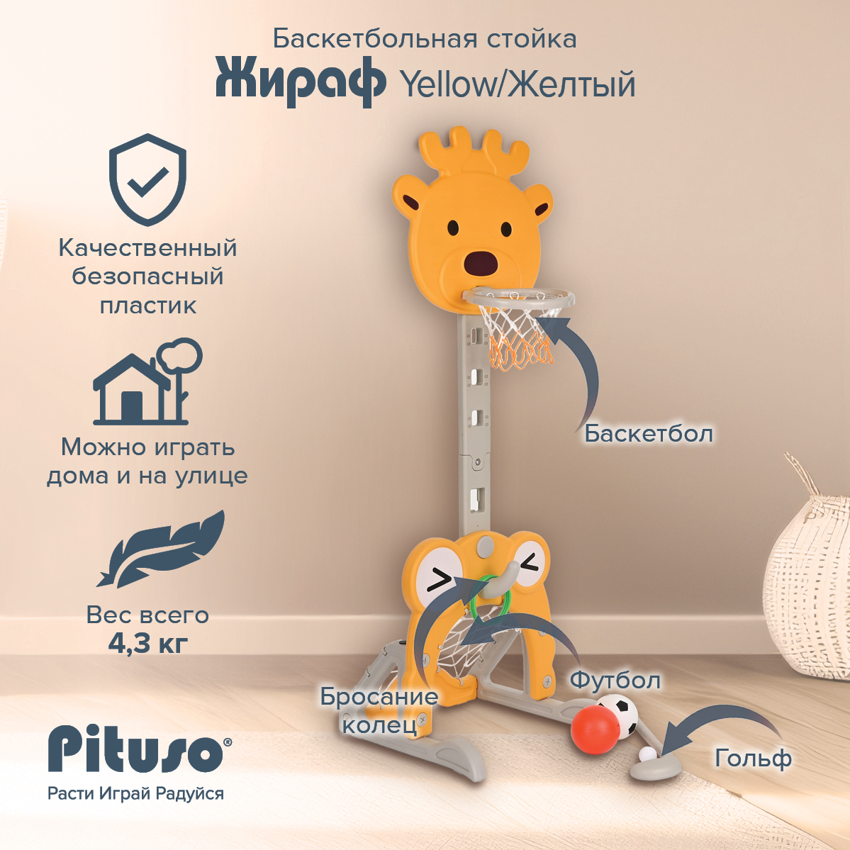 Баскетбольная стойка с веселым Жирафом изготовлена из качественного и безопасного пластика.